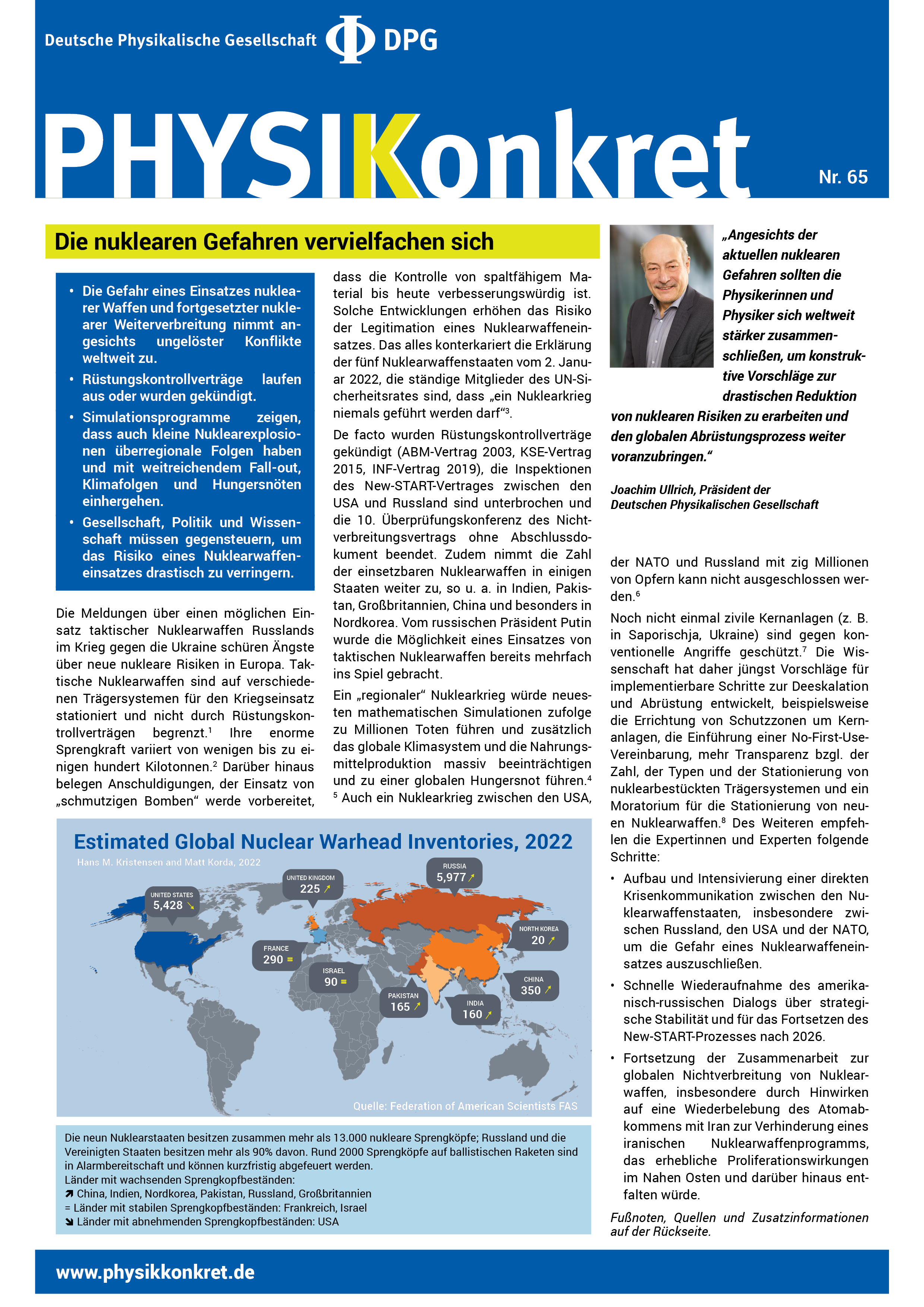 „Physikerinnen und Physiker müssen noch mehr vor den unabsehbaren Gefahren einer nuklearen Auseinandersetzung warnen und sich weltweit zusammenschließen, um Vorschläge zur drastischen Reduktion von nuklearen Risiken zu erarbeiten“, mahnt Joachim Ullrich, Präsident der Deutschen Physikalischen Gesellschaft, anlässlich der Herausgabe des aktuellen Faktenblattes Physikkonkret Nr. 65. Es warnt vor der steigenden Gefahr einer globalen nuklearen Bedrohung und beschreibt Wege zur Deeskalation.
