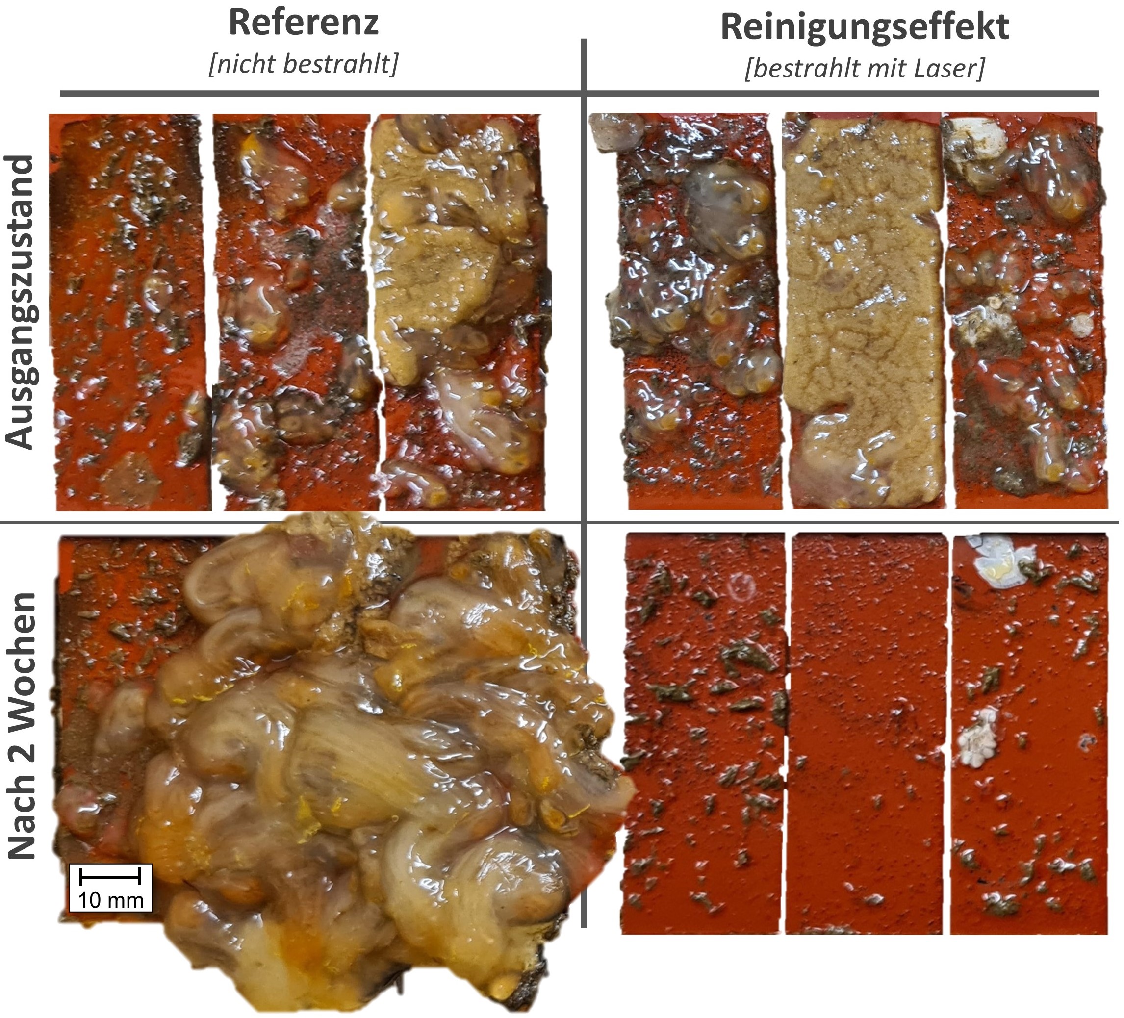 Mit Laserstrahlung lässt sich der marine Bewuchs unter Wasser letal schädigen, ohne dabei die darunterliegende Beschichtung des Schiffsrumpfs zu beschädigen. Die LZH-Wissenschaftler:innen haben dazu einen Prozess entwickelt, bei dem die Zellen des Bewuchses durch Laserstrahlung so geschädigt werden, dass der Bewuchs abstirbt und dann nach einiger Zeit einfach von der Wasserströmung weggespült wird.