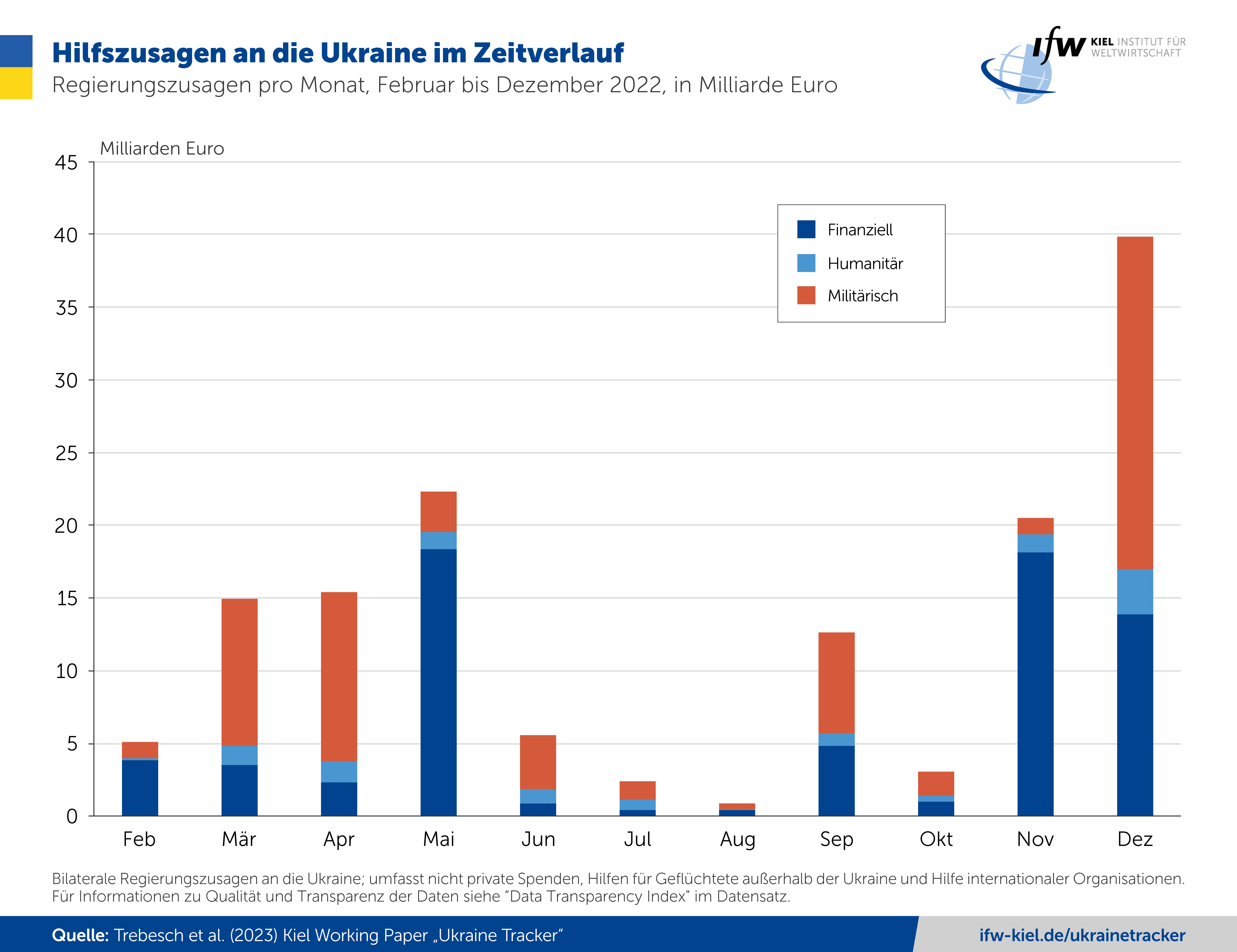 Über das Jahr 2022 betrachtet, legten die USA mit großen Unterstützungsbeschlüssen für die Ukraine vor, die EU-Länder folgten mit einiger Verzögerung und überholten die USA zwischenzeitlich mit ihren Gesamtzusagen. Mit den nun zusätzlich erfassten Daten (21. November bis 15. Januar) übernehmen die USA wieder die Führung. Mit weiteren Zusagen im Volumen von 37 Mrd. Euro im Dezember haben die Amerikaner insgesamt knapp über 73,1 Mrd. Euro für die Unterstützung der Ukraine vorgesehen. Für die EU beträgt der vergleichbare Wert 54,9 Mrd. Euro. Insgesamt blieben im Jahresverlauf die Zusagen humanitärer Unterstützung relativ konstant und verloren damit an Gewicht, während der Anteil finanzieller und militärischer Hilfszusagen wuchs. Nach einem Abbrechen des Stroms neuer Zusagen im Sommer schwoll dieser gegen Jahresende wieder auf Rekordhöhe an.