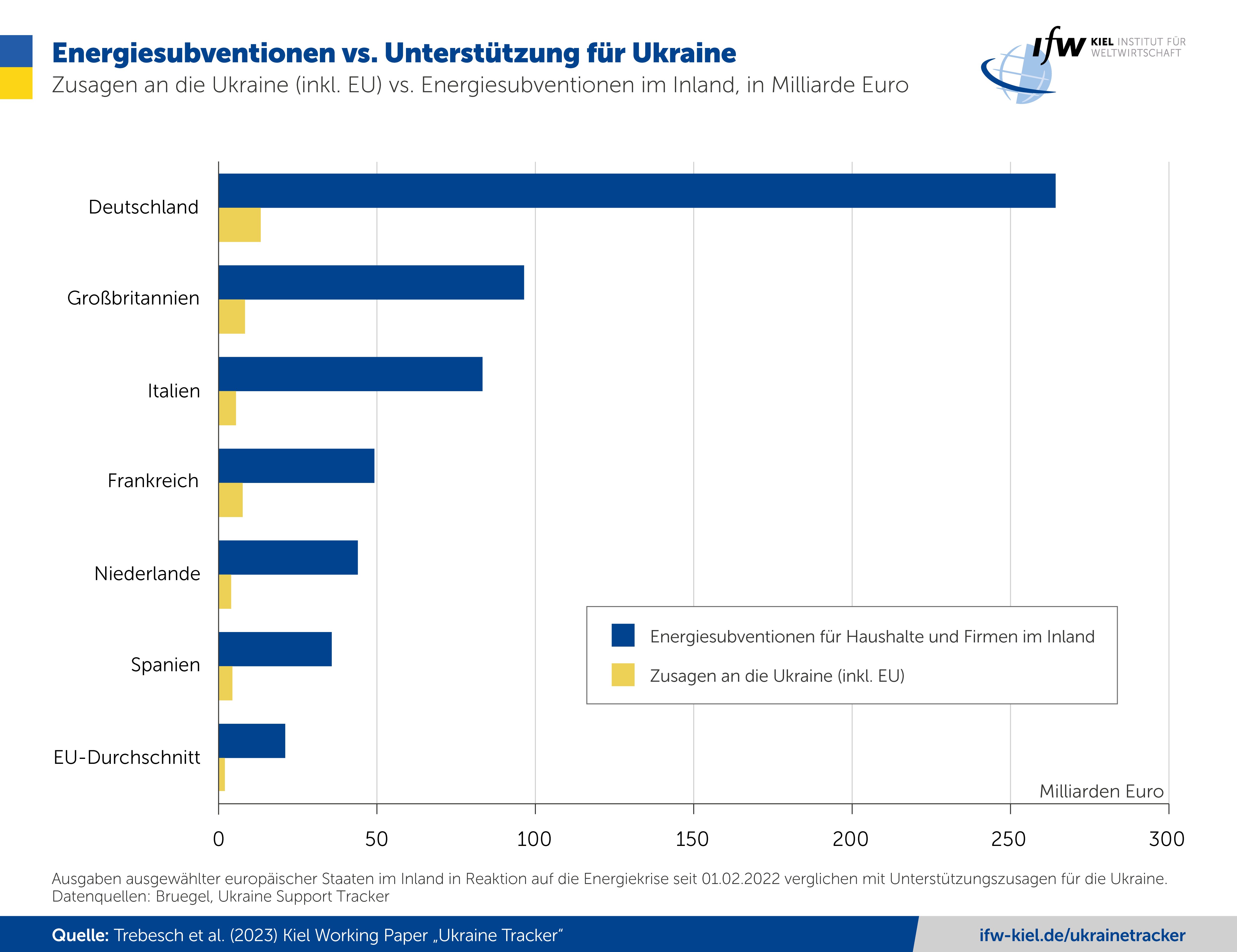 Alleine Deutschland hat seit Januar 2022 mehr als 250 Mrd. Euro an Subventionen angekündigt, um den Anstieg der Energiepreise für Verbraucher und Unternehmen abzufedern, während sich die bilateralen Hilfszusagen an die Ukraine auf 6,15 Mrd. Euro summieren, plus anteilig 7,2 Mrd. Euro über die EU. Das sind zusammen nur 5 Prozent der angekündigten Energiehilfen. Andere EU-Länder versprachen auch große einheimische Energiepakete, im Schnitt das Zehnfache der Summe, die sie für die Unterstützung der Ukraine aufgewendet haben.