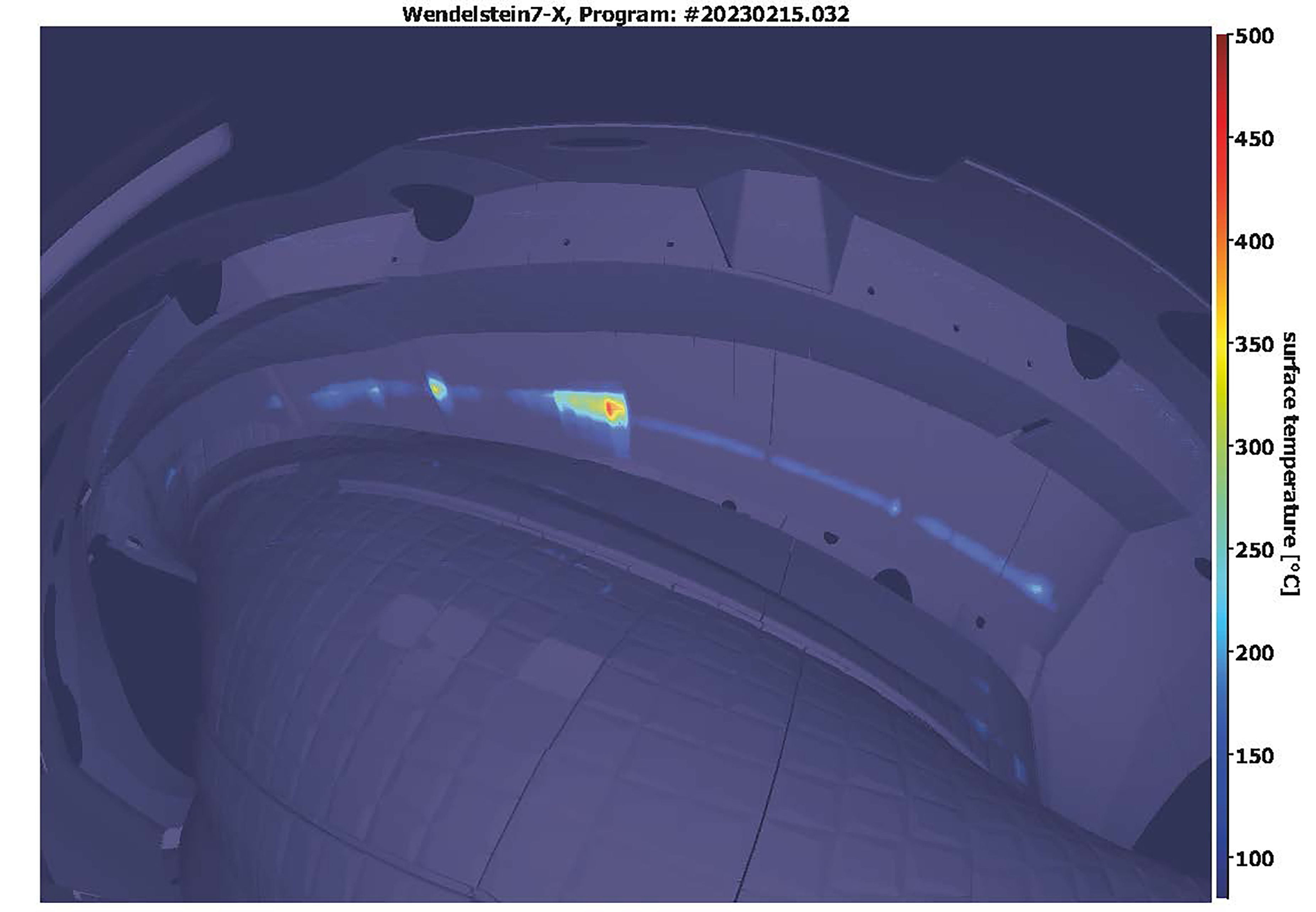 Infrarotaufnahme aus dem Vakuumgefäß von Wendelstein 7-X. Das Bild zeigt NICHT das Plasma an sich, sondern die Temperaturverteilung an den wassergekühlten Divertor-Prallplatten. Die Divertor-Prallplatten werden zur Abführung der Wärme aus dem Plasma eingesetzt. Deutlich erkennbar ist eine definierte Linie im Zentrum, die sogenannte Strike Line. Dort berührt das Plasma den Divertor und die Temperatur ist am höchsten. In einzelnen Bereichen werden bis zu 600 Grad Celsius erreicht (rote Flächen). Die Divertorkacheln können Temperaturen bis zu 1200 Grad Celsius aushalten.