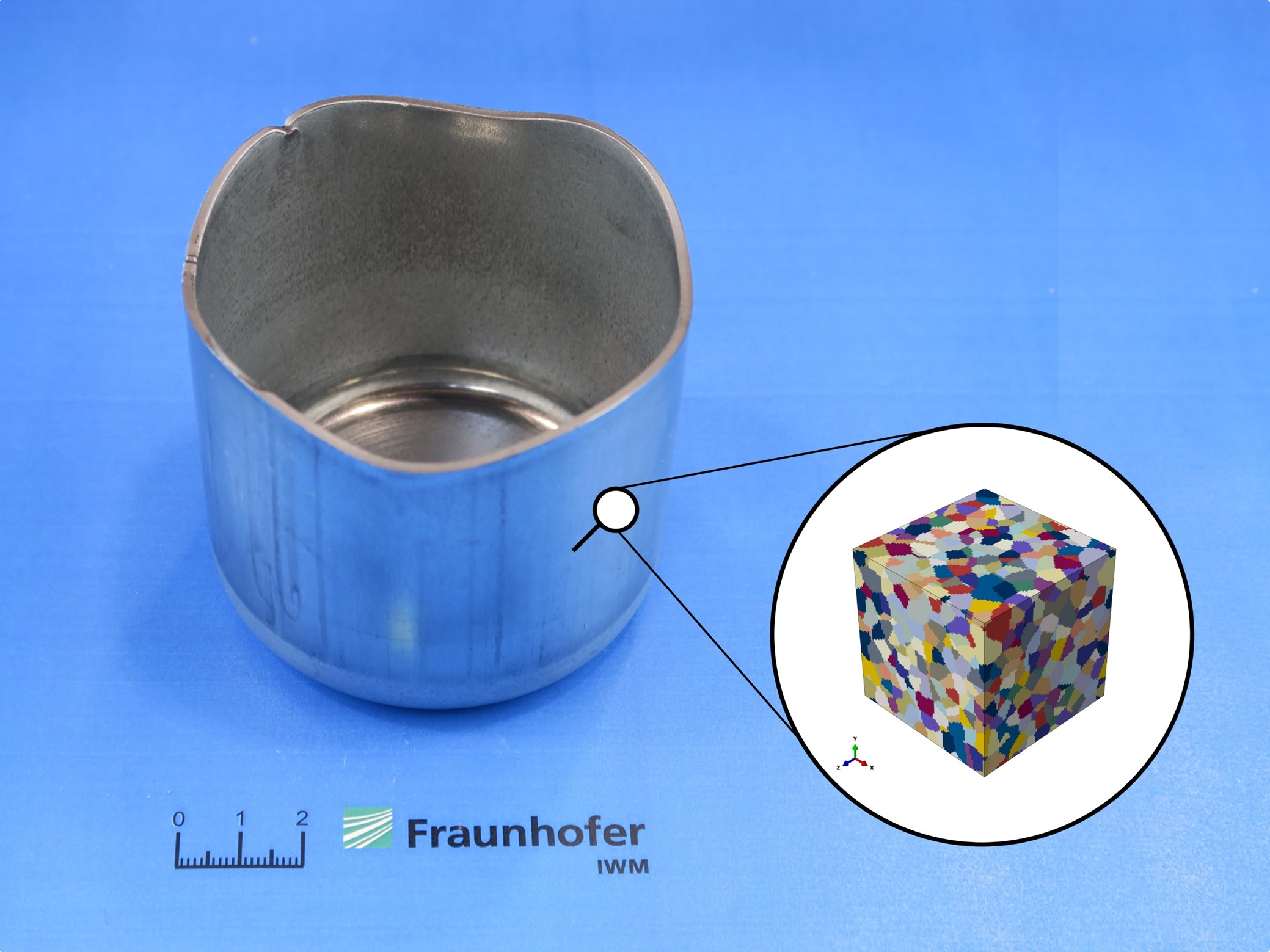 Das Fraunhofer IWM hat mit seinem Virtuellen Labor eine Möglichkeit geschaffen, diese Lücke zu schließen. »Wir bestimmen die Richtungsabhängigkeit der mechanischen Eigenschaften bei Blechwerkstoffen per Simulation«, erklärt Alexander Wessel, Wissenschaftler am Fraunhofer IWM in der Gruppe Umformprozesse. »Dabei bilden wir die Werkstoffe auf Mikrometerebene in einem Mikrostrukturmodell ab und sagen das makroskopische richtungsabhängige Werkstoffverhalten auf Basis der zugrundeliegenden physikalischen Mechanismen in der Mikroebene voraus.« Auf diese Weise lassen sich auch solche Blechwerkstoffe charakterisieren und die entsprechenden Werkstoffkennwerte für die Auslegung des Umformungsprozesses ermitteln, bei denen dies allein aus dem Experiment nicht möglich ist. »Bei unserem Vorgehen mit dem Virtuellen Labor kommen wir mit wenigen experimentellen Datenpunkten aus und errechnen uns die fehlenden Daten«, erläutert Wessel. Der zeitliche und finanzielle Aufwand ist somit im Vergleich zu einer rein experimentellen Charakterisierung deutlich niedriger. Für Unternehmen bedeutet das, dass sie die Entwicklungszeiten verkürzen und Kosten bei der Einführung neuer Umformprozesse einsparen.