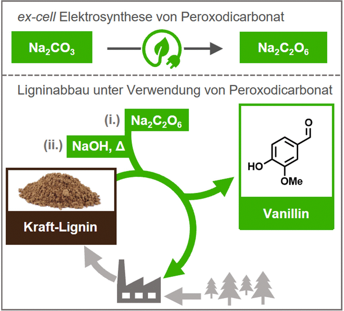 Die Forschungsgruppe um Siegfried Waldvogel von der Universität Mainz hat nun eine Methode der Vanillinproduktion aus Kraft-Lignin entdeckt, die umweltverträglich ist, ohne schädliche Chemikalien auskommt und zudem Rohstoffe nutzt, die bei der Zellstoffproduktion vorhanden sind. Ein Schlüsselschritt ist die Herstellung des Oxidationsmittels durch Elektrolyse von Natriumcarbonat.