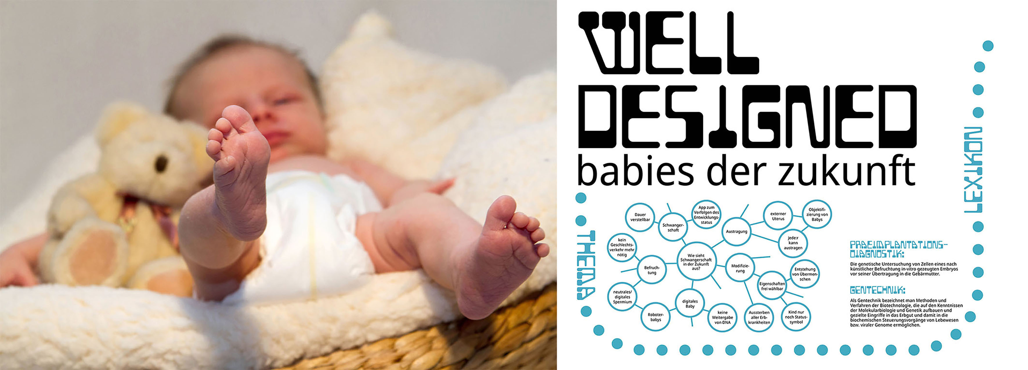Ganz wie bei einem realen Besuch in einer Praxis oder Klinik haben die beiden Kommunikationsdesignerinnen ein Anmeldeformular für das Jahr 2074 entwickelt: Man kann dort ebenso als Nachwuchs eine „designed person“ wünschen, wie auch die Art der Entbindung festlegen – zur Option stehen „selbst“, „ExUti 3.0“ (externe Gebärmutter), „RobUterus“ (Roboter-Gebärmutter) oder „Leihmutterschaft“. Auf Basis von drei Personas zeigen sie auf, welche Charaktere welche Wahlen treffen könnten, um ihr Leben mit Nachwuchs entsprechend zu gestalten. Über die Jahrzehnte zeigen sie auf, wie sich gesellschaftliche Perspektiven sowie persönliche Meinungen im Zuge künftiger Technologie und Verfahren ändern bzw. diese prägen.
