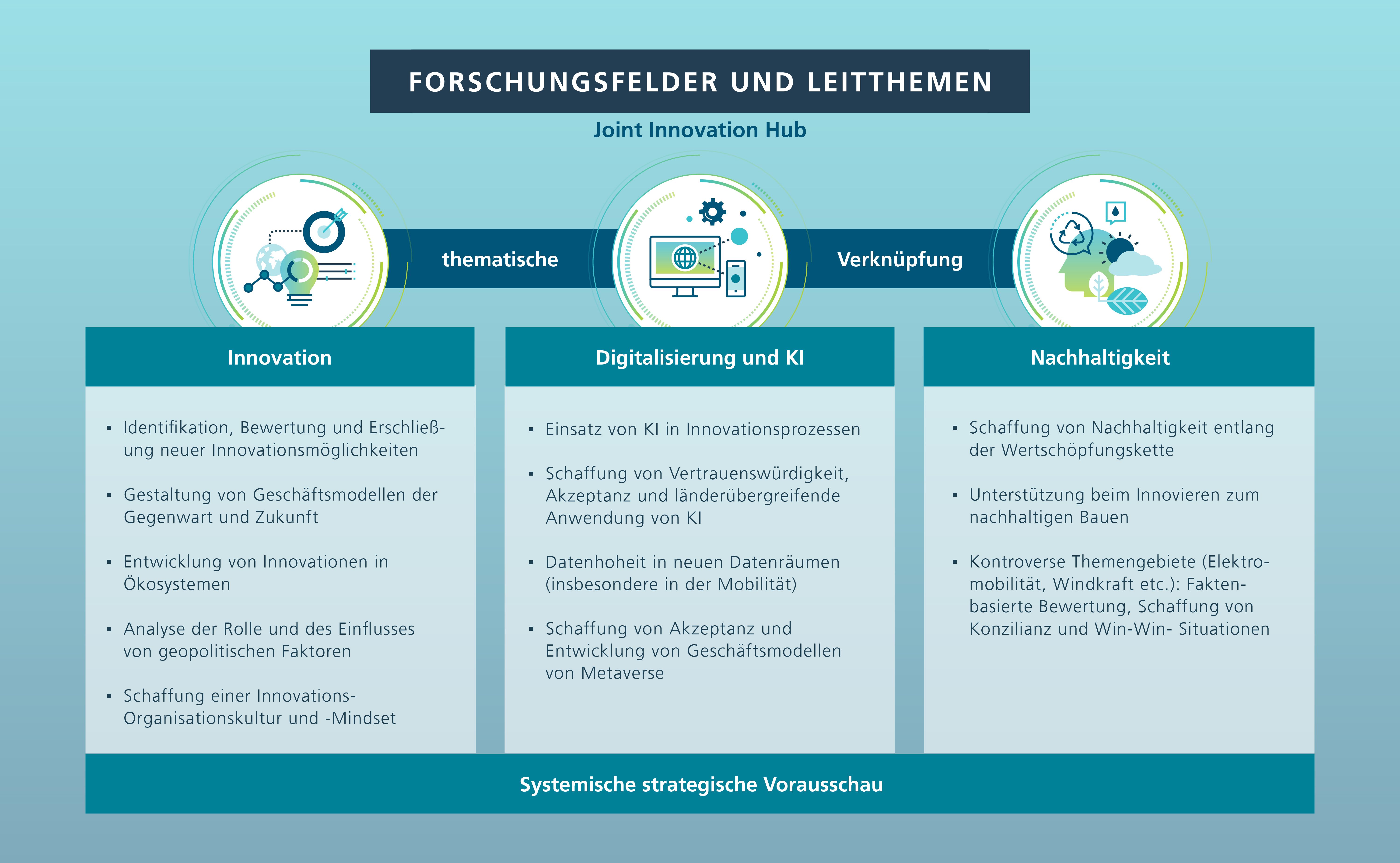 Die bestehenden Forschungsaktivitäten des Joint Innovation Hub (JIH) am Fraunhofer ISI werden künftig deutlich ausgeweitet – dazu erklärt Univ.-Prof. Dr. Marion A. Weissenberger-Eibl, Institutsleiterin des Fraunhofer ISI und Leiterin des Joint Innovation Hub in Karlsruhe und Heilbronn: »Mit Wirkung zum 1. Januar 2023 hat der Joint Innovation Hub am Fraunhofer ISI neben seinem bestehenden Standort in Karlsruhe einen zweiten in Heilbronn: Die neue Forschungsgruppe wurde in Zusammenarbeit mit der gemeinnützigen Dieter-Schwarz-Stiftung gegründet und hat ihren Sitz auf dem Bildungscampus Heilbronn. Damit ist der Joint Innovation Hub Heilbronn - kurz: »JIH-Heilbronn« - in das dynamische Innovationsökosystem in Heilbronn eingebettet. Der Fokus liegt auf dem systemischen Innovations- und Technologiemanagement in den Forschungsfeldern Innovation, Digitalisierung und Künstliche Intelligenz sowie Nachhaltigkeit der Region Heilbronn-Franken«.