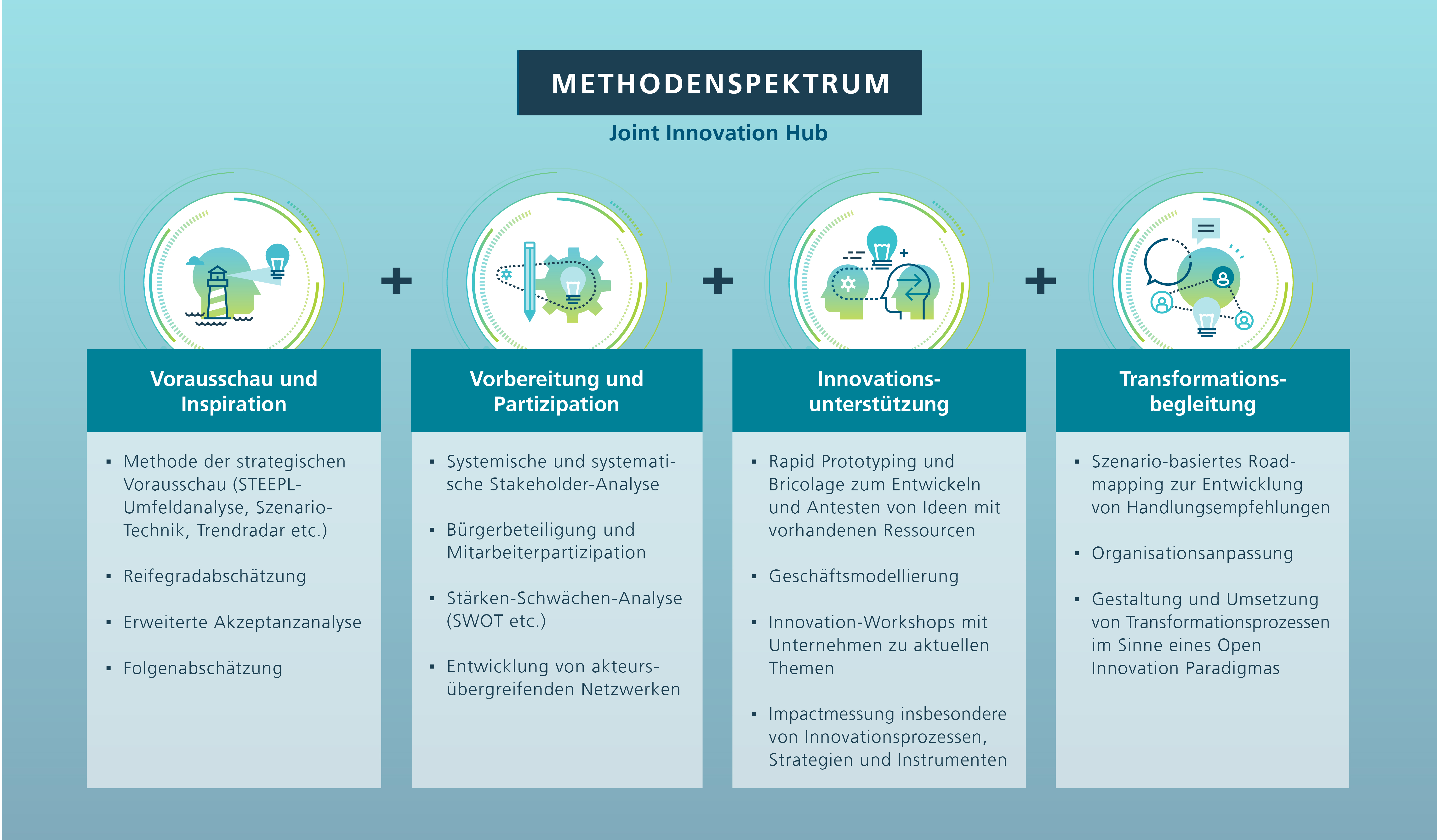 Durch seine ganzheitliche Perspektive auf die großen Herausforderungen unserer Zeit und die spezifischen Bedürfnisse der regionalen Stakeholder unterstützt der Joint Innovation Hub Heilbronn Akteure aus Wirtschaft, Wissenschaft, Bildung, Gesellschaft und Politik entlang des gesamten Innovationsprozesses vom frühen Signal bis hin zur Impact-Messung. Dies umfasst die Vorausschau von, Vorbereitung auf und Mitgestaltung von relevanten technologischen, wirtschaftlichen und sozialen Trends, das schnelle und bedarfsgerechte Entwickeln von Innovationsideen, Prototypen und Geschäftsmodellen insbesondere in Innovationsökosystemen sowie die wirksame Transformation von Organisationen in Bezug auf Strategie, Struktur und Kultur.