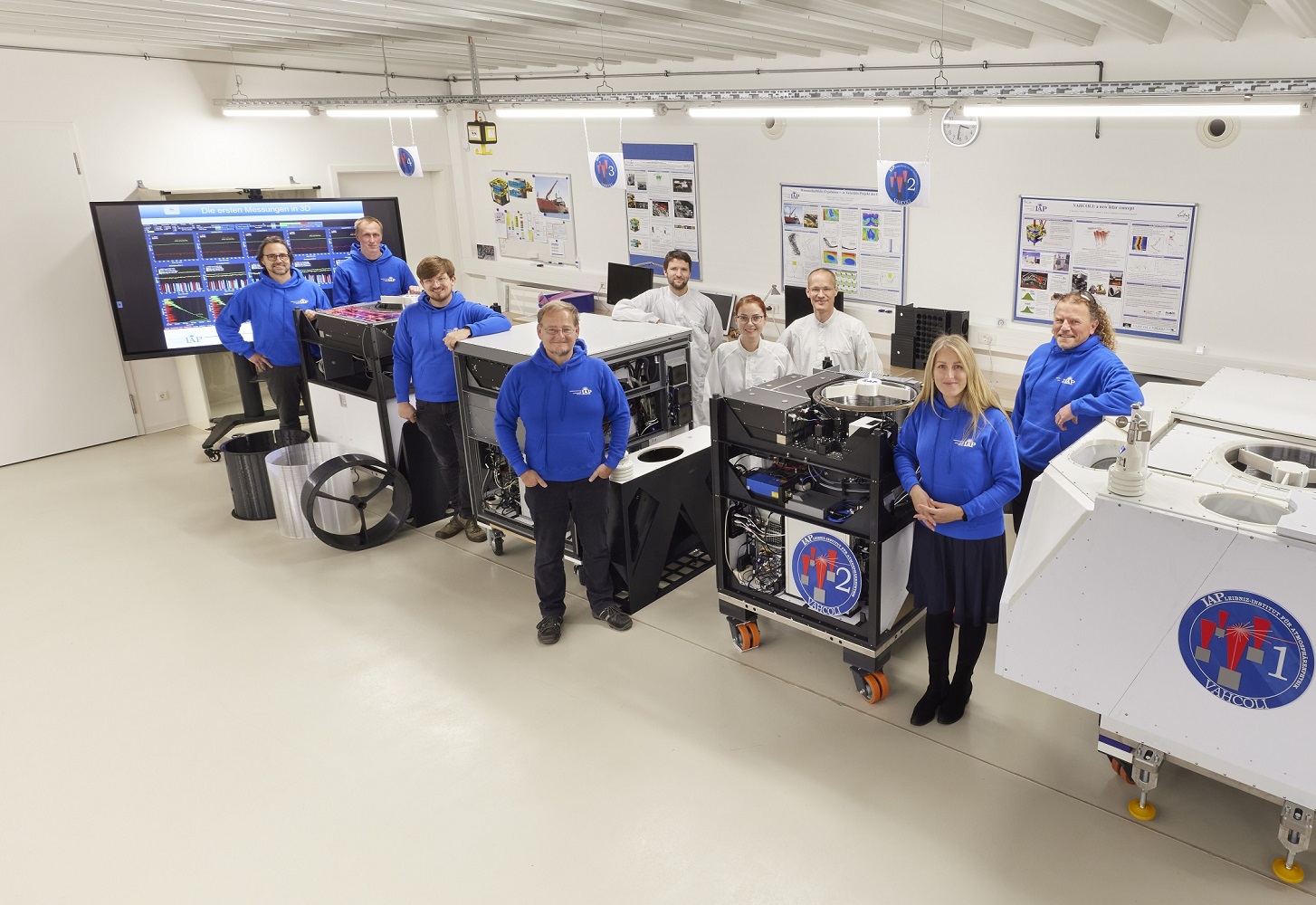 In May and November 2022, the latest generation of lasers was installed in two of the LIDAR systems in Kühlungsborn and measurements up to 100 km altitude have already been demonstrated. The basis for this work is a constantly growing team. The work in Aachen and Kühlungsborn was funded in the VAHCOLI (Vertical And Horizontal COverage by Lidar) project. The focus is on the exploration of the atmosphere in vertical and horizontal direction. This is achieved by one laser directed to four telescopes tilted by 30° (Image 7). With four such LIDAR systems in the network, areas of several 10,000 km² in the sky can be surveyed. This is then by far the most modern and capable LIDAR system for the middle atmosphere worldwide.