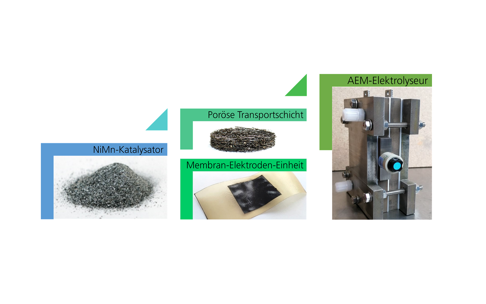 Derzeit sind im größeren Maßstab vor allem drei Elektrolyseverfahren im Einsatz. Technisch relevant und historisch am weitesten verbreitet ist die alkalische Elektrolyse (AEL), bei der dem Wasser zum Beispiel Kaliumhydroxid zugegeben wird. Ein Nachteil ist der geringe untere Teillastbereich, das heißt, dass bei Nutzung eines fluktuierenden Stromangebots nicht die gesamte Bandbreite als elektrische Last abgenommen werden kann. Bei der Elektrolyse mit einem Protonenaustauschmembran-Elektrolyseur (Proton Exchange Membrane, PEM-EL) wandern Wasserstoffionen in stark saurer Umgebung durch eine gasdichte Membran, die in direktem Kontakt zu den Elektroden steht (sogenannte Membran-Elektroden-Einheit oder Membrane Electrode Assembly, MEA). Dieser Ansatz ermöglicht eine hohe Leistungsdichte und ein sehr dynamisches Lastverhalten bei stets hoher Gasreinheit – allerdings benötigt man für die Elektroden seltene und teure Edelmetalle wie Iridium, die der stark korrosiven Umgebung standhalten, sowie teure Membranen.