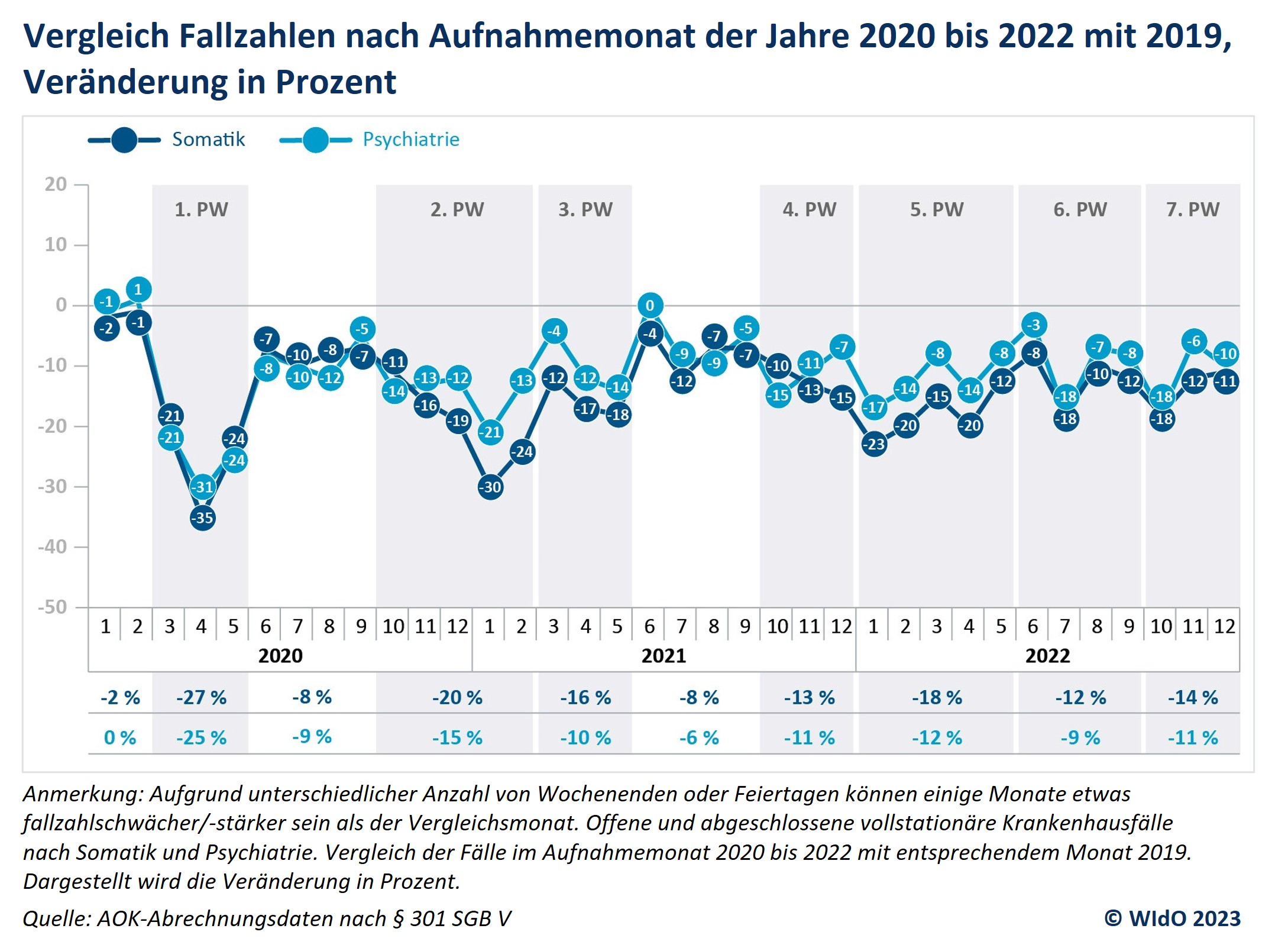 Die Zahl der somatischen Krankenhaus-Fälle in Deutschland ist 2022 im Vergleich zum Jahr 2019 um 15 Prozent gesunken – und damit noch stärker als 2020 (minus 13 Prozent) und 2021 (minus 14 Prozent). Bei den psychiatrischen Fällen war der Rückgang 2022 gegenüber 2019 mit 11 Prozent etwas weniger stark ausgeprägt. Das zeigt eine Analyse des Wissenschaftlichen Instituts der AOK (WIdO).