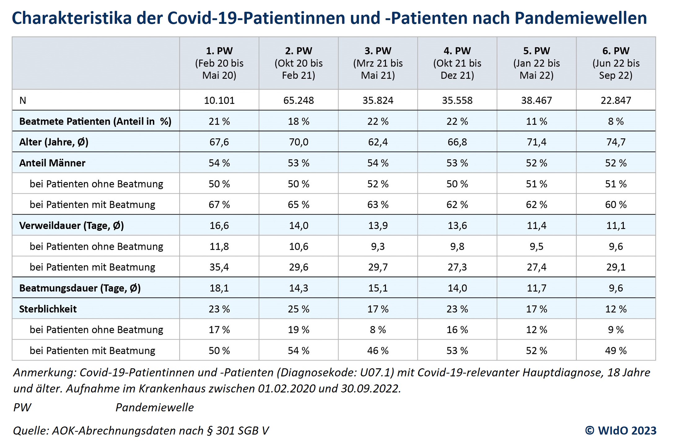 Das WIdO hat in seiner Auswertung auch die Entwicklungen bei den stationär behandelten Patientinnen und Patienten betrachtet, die wegen Covid-19 im Krankenhaus waren. Im Zuge der Omikron-Wellen hat der Anteil der Patientinnen und Patienten, die nicht primär wegen Covid-19 im Krankenhaus waren, aber diese Diagnose auch aufwiesen, im Jahr 2022 deutlich zugenommen. Für einen konsistenten Vergleich über die Pandemiewellen hinweg wurde die Auswertung daher auf Patientinnen und Patienten beschränkt, bei denen Covid-19 der primäre Behandlungsanlass war.