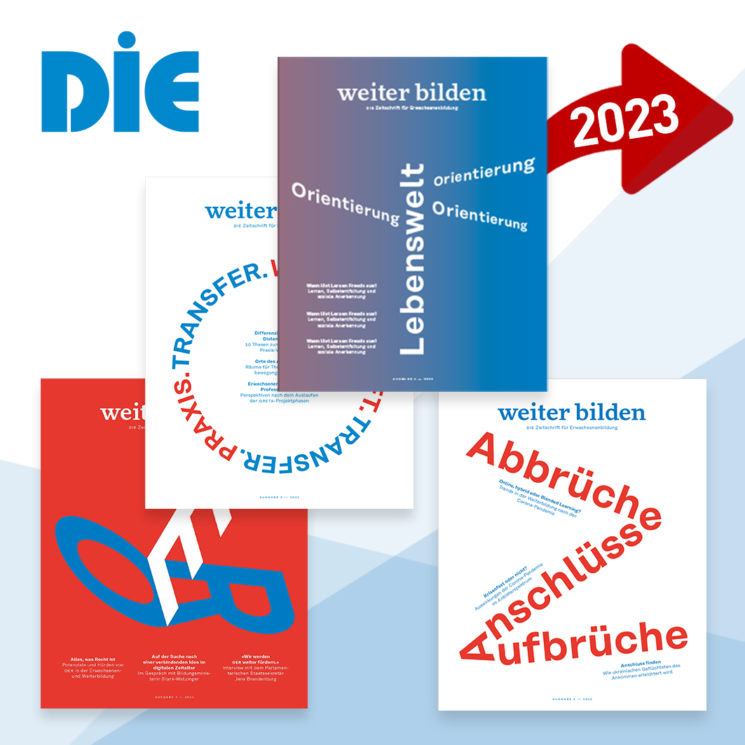 Auch neu im Jahr 2023: Die „weiter bilden“ wird im Open Access erscheinen und kann dann als kostenloses PDF heruntergeladen, gelesen und geteilt werden. Damit verfolgt das DIE seine Openness-Strategie konsequent weiter. Zugleich wird es die Zeitschrift weiterhin als gedruckte Ausgabe geben.