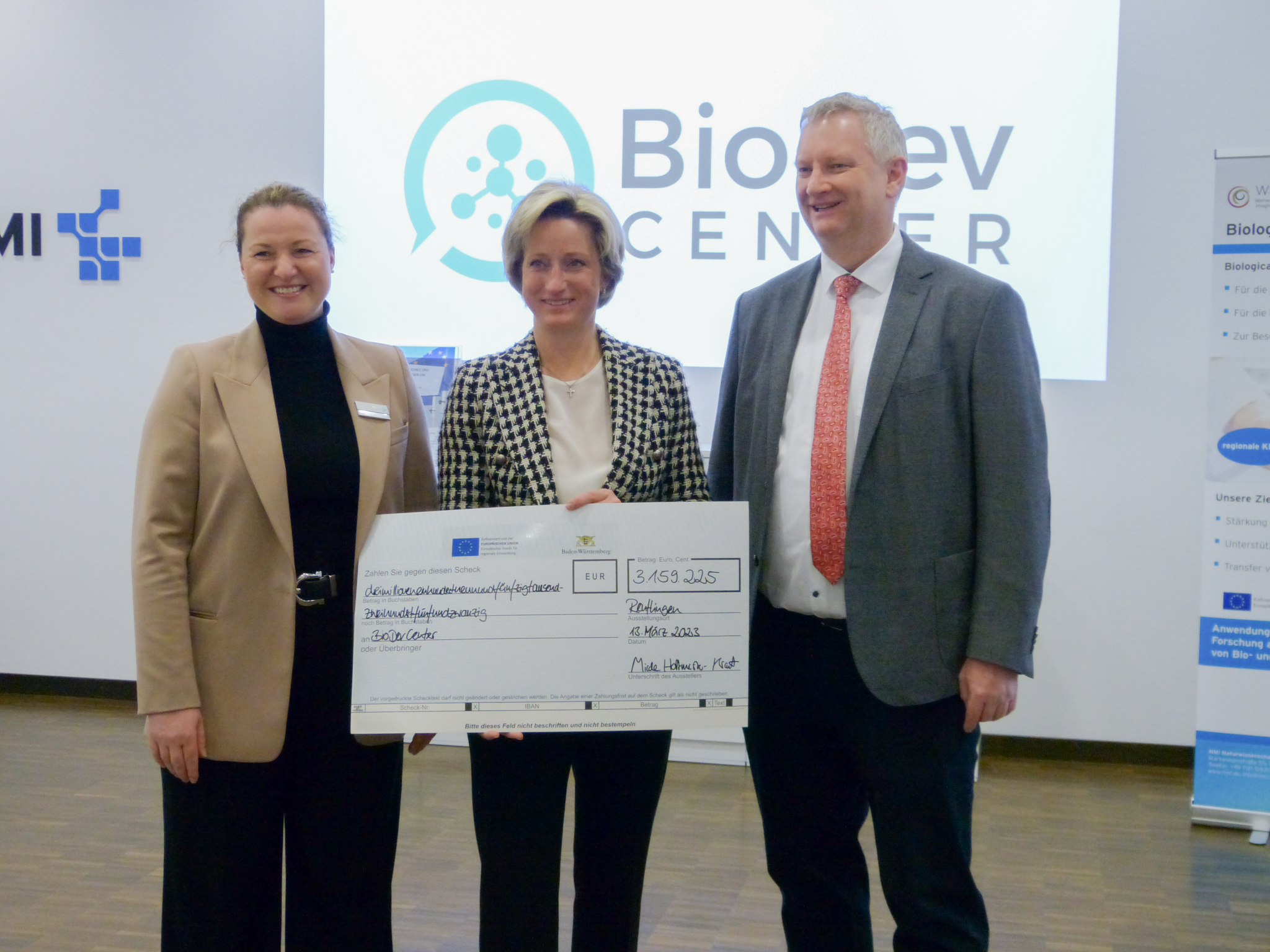 Das NMI erhält zur Etablierung des BioDevCenter für die anstehende Forschung eine Zufinanzierung vom Land Baden-Württemberg und der EU. Die heutige Übergabe ist der offizielle Startschuss für das Leuchtturmprojekt „Biologicals Development Center“. Das Leuchtturmprojekt ist das siebte Projekt aus dem Wettbewerb RegioWIN 2030, das durch das Wirtschaftsministerium bewilligt wird. „Ich bin überzeugt, dass der Aufbau und der Betrieb des Biologicals Development Center in Reutlingen und Tübingen die baden-württembergische Gesundheitswirtschaft nachhaltig stärken wird“, sagte Ministerin Hoffmeister-Kraut. Und weiter „Dies ist gerade im Hinblick auf den globalen Standortwettbewerb wichtiger denn je.“