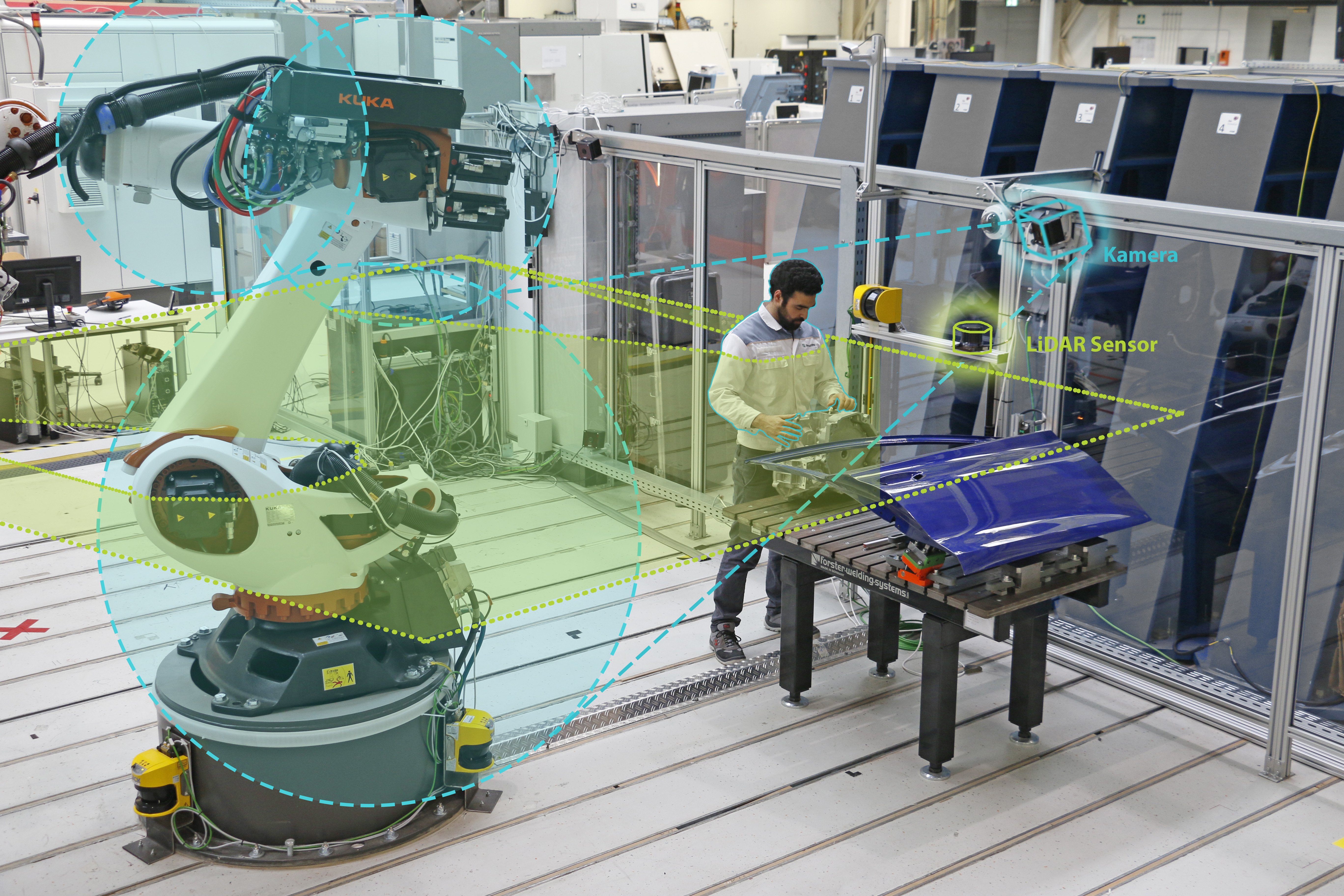 Die zentrale Fragestellung für die Forschenden in einem Anwendungsfall bei der SEAT S.A. war dabei: Wie kann ein Roboter dank »zusätzlicher Augen« seine Umgebung besser einschätzen und damit mehr Geschwindigkeit in seiner Bahn behalten? Dazu teilte das Team die Wahrnehmungsbereiche neu ein – in smarte Zonen. Bei schnelleren Bewegungen »wächst« eine solche Zone, um ein Kollisionsrisiko mit Menschen auszuschließen. Für die Umfelderfassung kommt dabei LiDAR-Sensorik (Light Detection and Ranging), die über gepulstes Laser-Licht Objekte erkennt und kategorisiert, ebenfalls zum Einsatz wie Kameras. Die Kombination von Reaktionszeiten (LiDAR: 50 Millisekunden, Kamera: 10 ms) und Überwachungsbereichen (LiDAR: größere Bereiche; Kamera: Nahfeld) erlaubt nun schnellere Bewegungen des Roboters. Um welchen Faktor genau sich die Prozesszeiten verkürzen lassen, hängt jeweils von der Tätigkeit und von der eingesetzten Hardware für Robotik und LiDAR-Sensorik ab. Anpassungsmöglichkeiten bei Bewegungsgeschwindigkeit und Beschleunigung erhöhen die Akzeptanz bei den Mitarbeitenden.