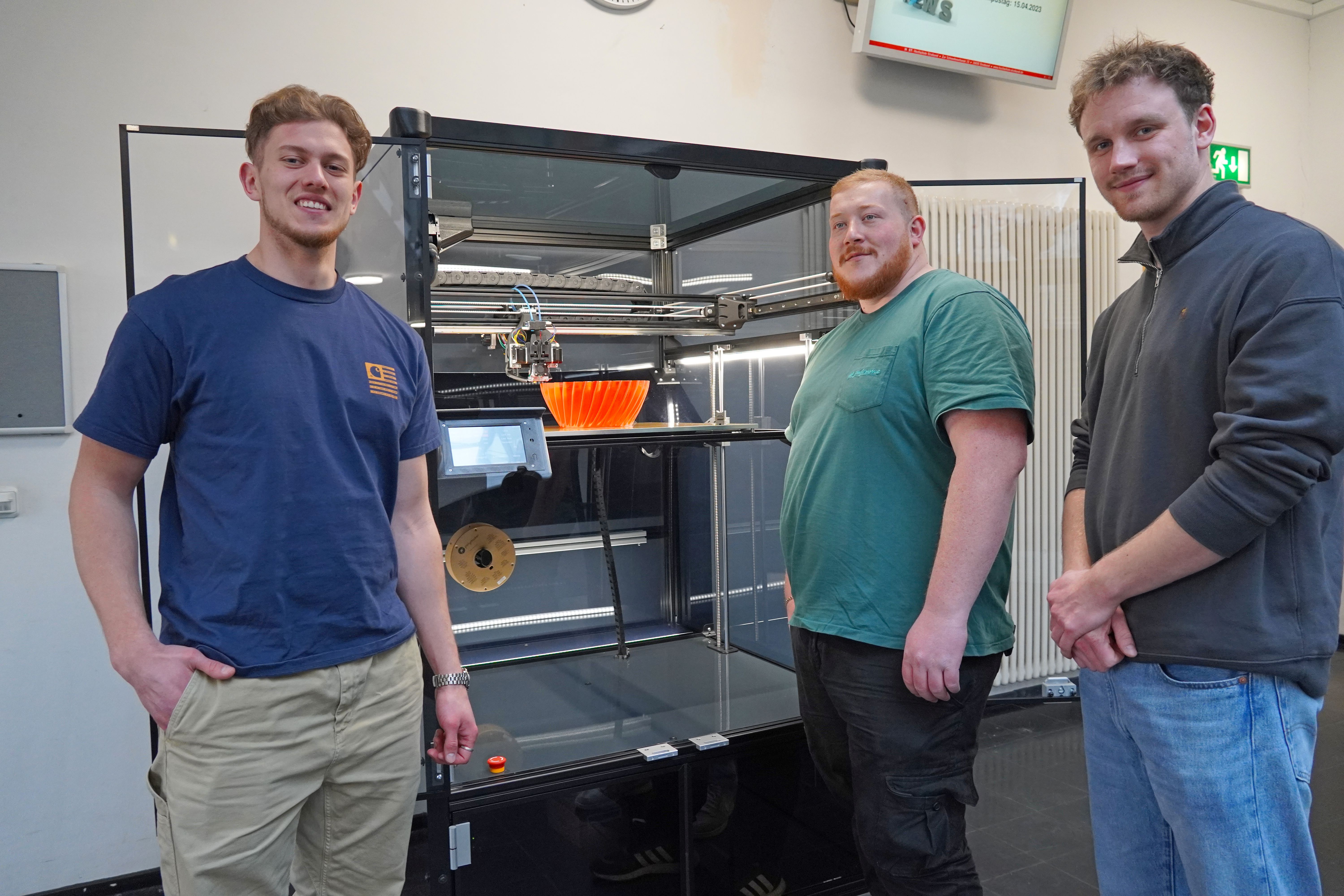 „Wer jetzt etwas drucken will, muss keine Umwege gehen, sondern kann sich einfach an die Fachschaft wenden und seine kreative Gedanken umsetzen. Das ist ein großer Mehrwert für die Studierenden“, sagt auch Prof. Dr. Mark Vehse. Der Dekan der Fakultät hat das Projekt unterstützt ebenso wie eine Reihe von Kolleg*innen. „Laboringenieur Andreas Reinke, Angela Schubert aus dem Sekretariat, der wissenschaftliche Mitarbeiter Reik Schick, Laboringenieur Thomas Panten und Prof. Dr. Heiko Meironke, die ihren Raum für den Bau zur Verfügung gestellt haben, Anne Dombrowsky und Heiko Wulf von der Beschaffung – Die Liste derer, die uns unterstützt haben, ist lang“, sagt Sven Klimaschewski, „und die drei haben das großartig gemacht. Das ist ein Projekt, dass der Hochschule und ihren Studierenden lang über ihre Studienzeit nutzen wird“. Die drei haben den Drucker zudem so konzipiert, dass er noch erweitert, vergrößert werden kann auf 800 mal 800 mal 800 Millimeter – in folgenden Projekten, von der nächsten Generation engagierter Studierender. Jan Wolframs, Jannes Lierckes und Leon-Cornel Schaows Studium endet bald, sie sind im siebten Semester und gehen als nächstes ins Praktikum über, Jan Wolfram zu MAN Energy Solutions Berlin, Leon-Cornel Schaow zu Dekra Automobil in Neubrandenburg und Jannes Liercke zum Sanitätshaus OT aktiv in Greifswald und zum Medizintechnikhersteller Osentec in Neubrandenburg.