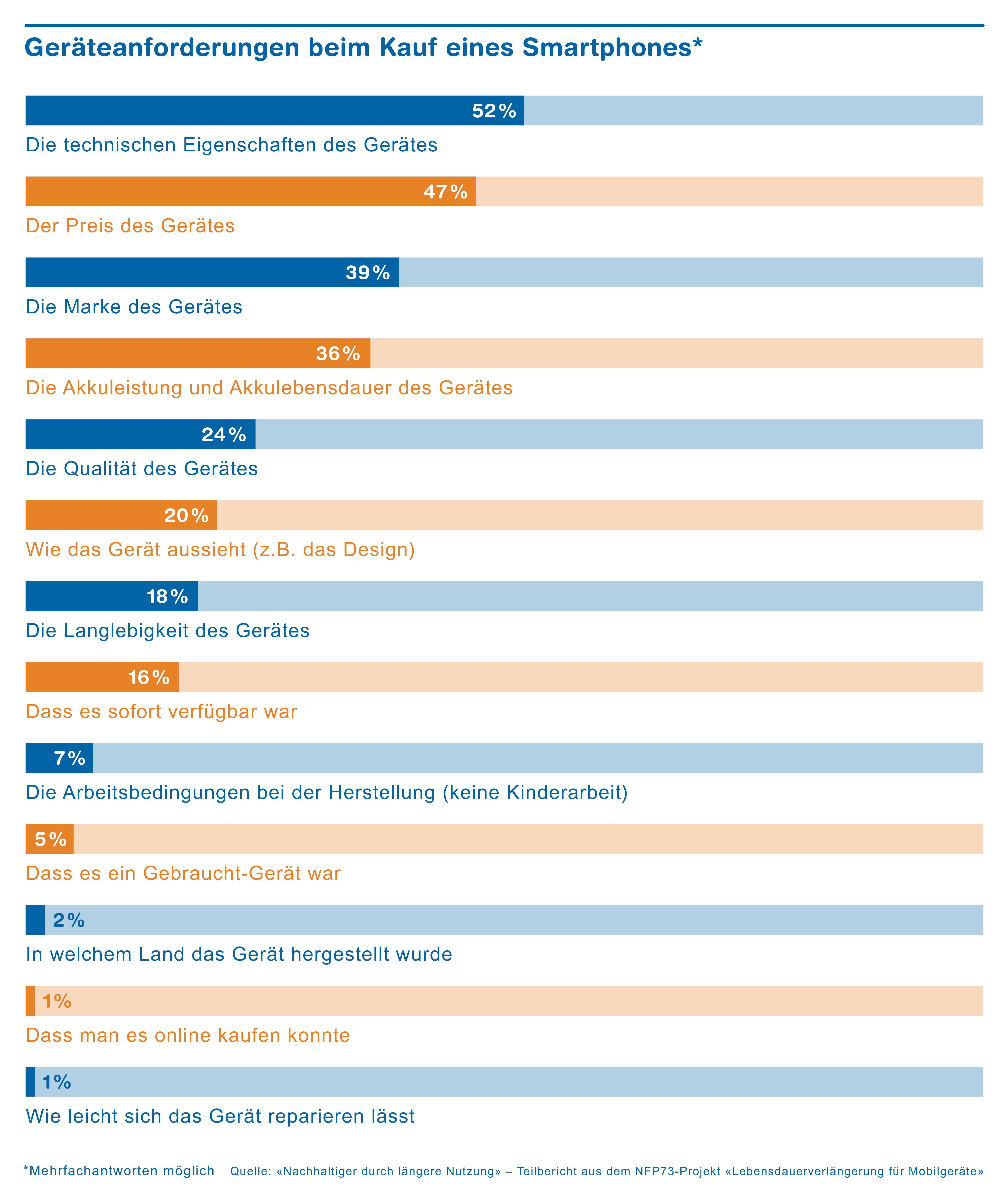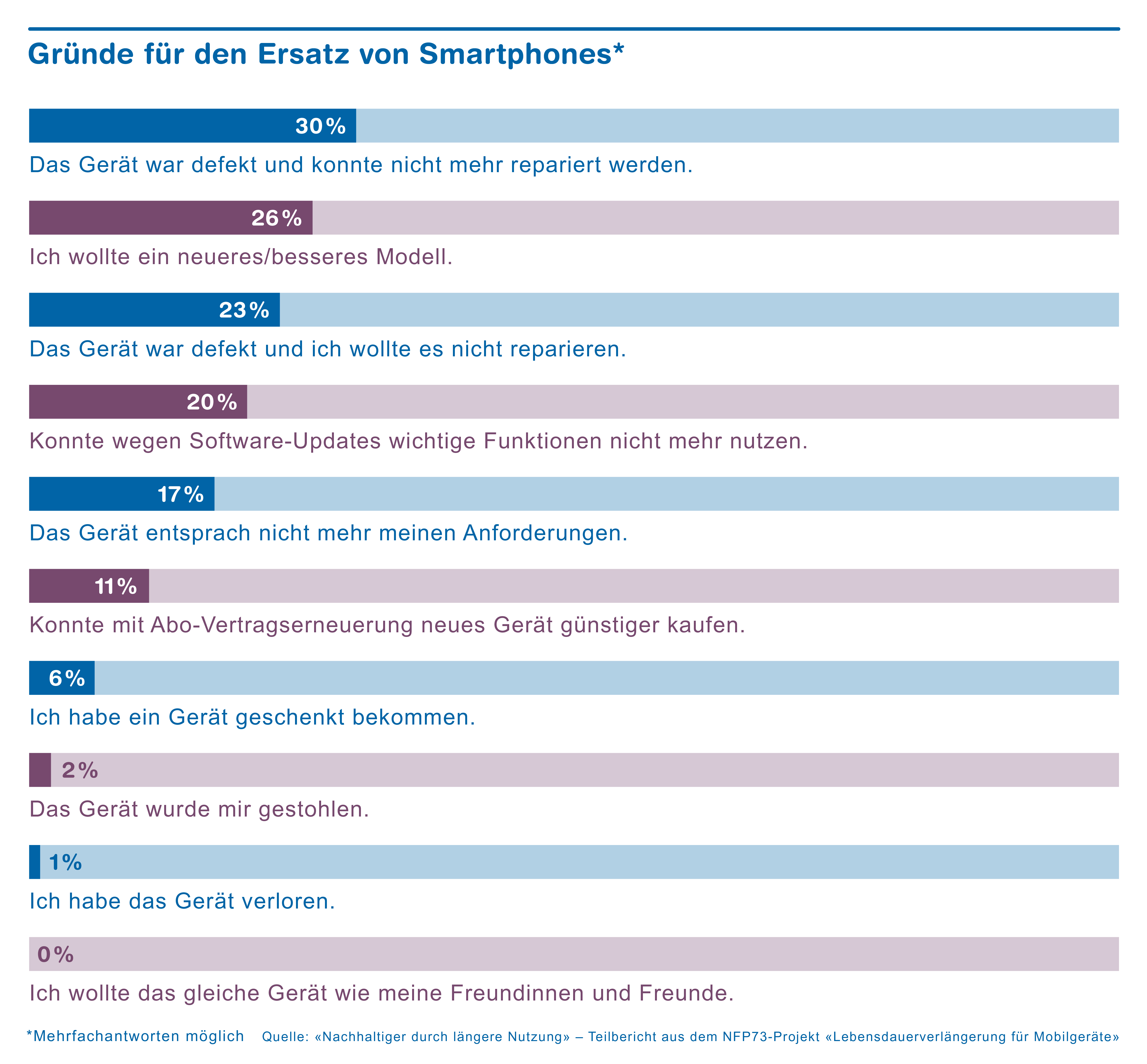Reparaturen sind bei Mobilgeräten ebenfalls selten. Von den Befragten liessen nur 7 Prozent ihr Telefon schon einmal flicken, obwohl sich die meisten bewusst sind, dass dies besser wäre für die Umwelt (91 Prozent) und weniger Geld kosten würde (53 Prozent). Bei den De-fekten waren am häufigsten das Display (42 Prozent) und der Akku (32 Prozent) betroffen. Beide Teile sind aber gut reparier- oder austauschbar. Eine Hürde scheint beim Aufwand zu liegen: 39 Prozent halten eine Reparatur für sehr kompliziert. Um Reparaturen zu fördern, empfehlen die ZHAW-Forschenden eine bessere Information über den Umweltnutzen und die Kostenersparnis sowie, die Verkäufer zu einem einfach zugänglichen Service zu verpflichten.
