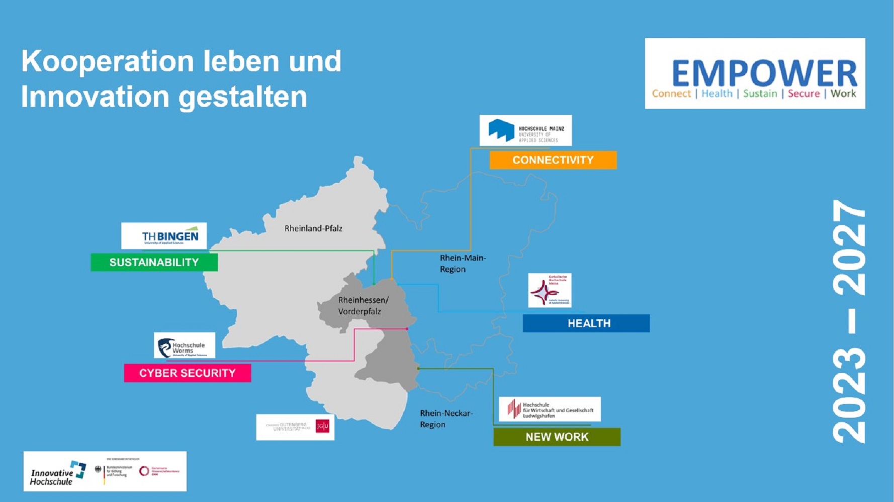 Ziel von EMPOWER ist es, den forschungsbasierten Ideen-, Wissens- und Technologietransfer mit Wirtschaft und Gesellschaft in der Rhein-Main-Neckar-Region zu fördern. Dazu bringt jede der fünf am Transferbündnis beteiligten Hochschulen inhaltlich ihre Expertise zu einem Megatrendthema ein: