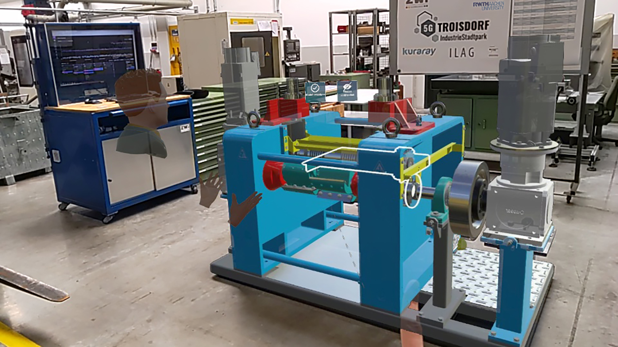 Kernstücke sind eine Produktionsmaschine des Projektpartners ZWi Technologies, die auf der Produktionsstraße des Projektpartners Kuraray Europe in Troisdorf eingesetzt wird, und ihr Digitaler Zwilling. Die digitalen Konstruktionsdaten der Maschine werden passgenau in das Sichtfeld der Benutzenden auf den Datenbrillen eingeblendet und mit Informationen angereichert. Die Kommunikation der räumlich entfernten Benutzenden am Digitalen Zwilling der Produktionsmaschine wird durch Avatare, Zeigegesten, direkte Manipulation sowie Audio- und Video-Kommunikation unterstützt.