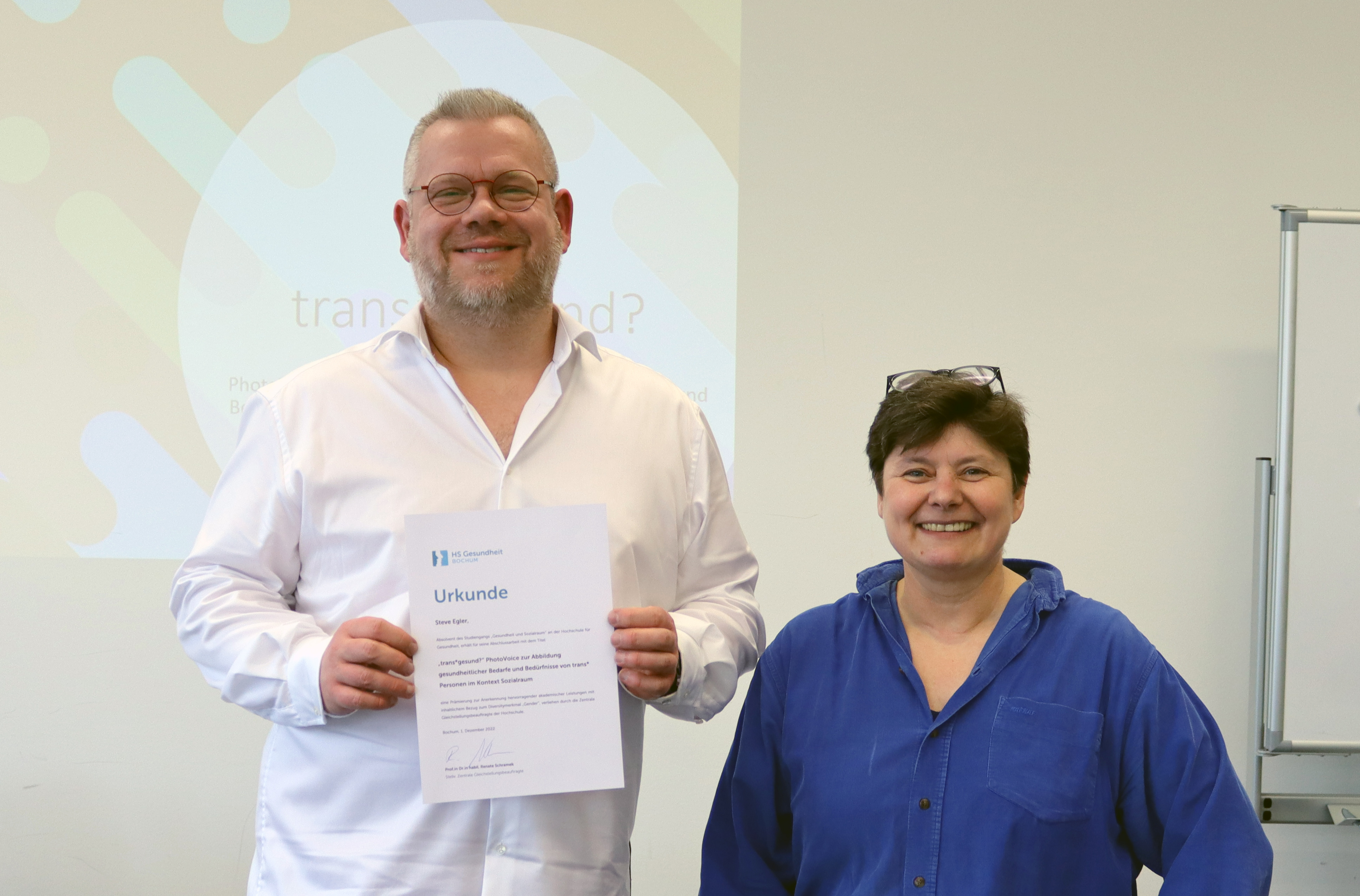 Erstmals wieder in Präsenz fand die diesjährige „Lunch Lecture“ der Gleichstellungsbeauftragten der Hochschule für Gesundheit (HS Gesundheit) in Bochum statt. In diesem Rahmen wurde Steve Egler, der an der Hochschule „Gesundheit und Sozialraum“ studiert hat, für seine Bachelorarbeit mit dem Titel „Trans*gesund?“ PhotoVoice zur Abbildung gesundheitlicher Bedarfe und Bedürfnisse von Trans* Personen im Kontext Sozialraum“ geehrt. Die Auszeichnung wird an der HS Gesundheit einmal im Jahr für eine herausragende gendersensible Bachelor-Arbeit vergeben. Im Anschluss erhielt der Preisträger die Möglichkeit, das Thema seiner Arbeit vorzustellen, bevor bei einem kleinen Imbiss zur Mittagszeit die Möglichkeit zum Austausch bestand.