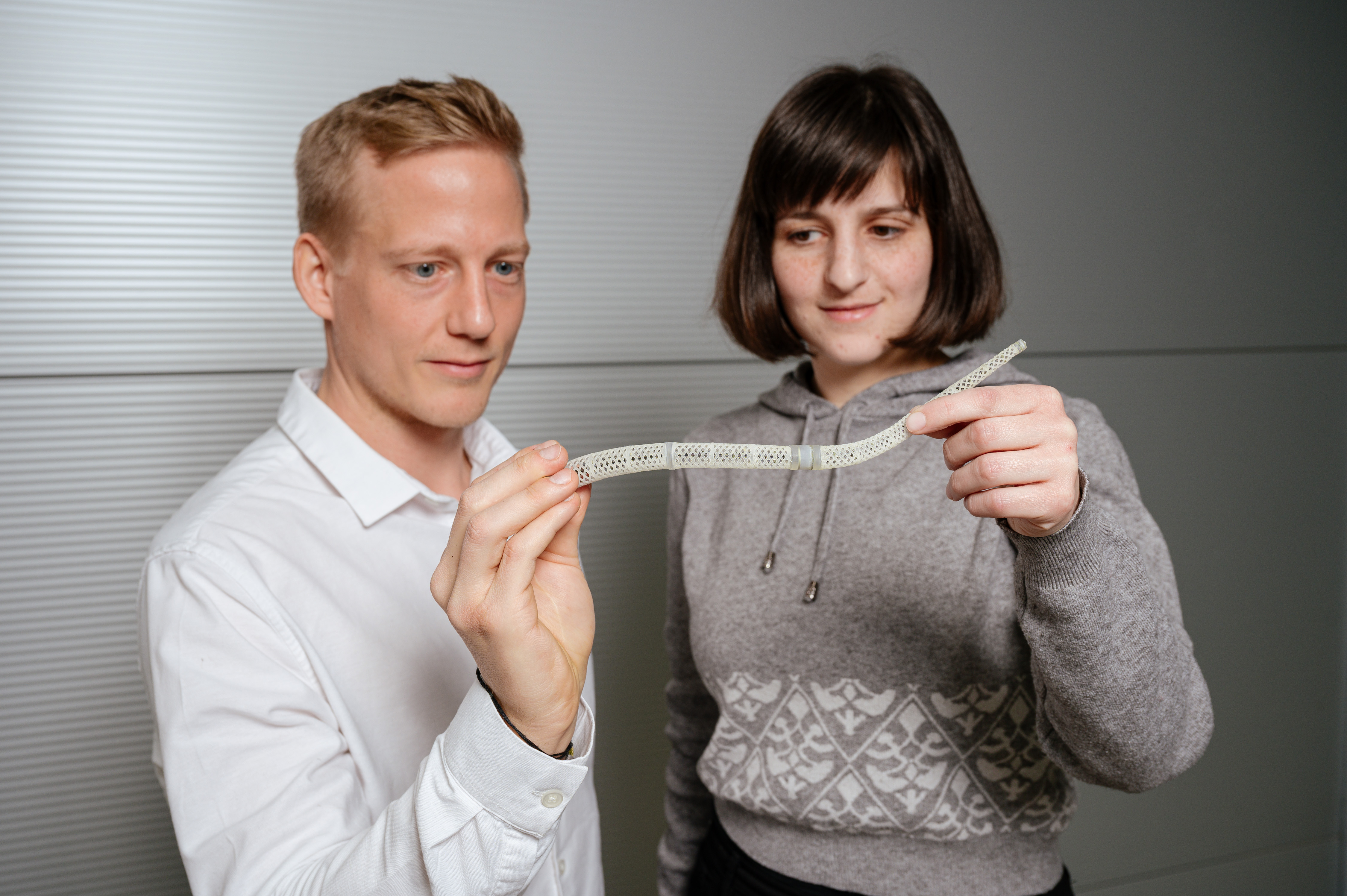 Die Forscherinnen und Forscher setzen den Rüssel aus vielen der künstlichen Muskelstränge zusammen. Wie echte Muskelfasern, die in Bündeln zusammengefasst sind, bündeln sie dafür auch die haarfeinen Drähte. Drahtbündel geben durch die größere Oberfläche mehr Wärme ab, was die Kontraktionen schneller macht. Und stark sind sie auch: „Die Drähte haben die höchste Energiedichte aller bekannten Antriebsmechanismen und entwickeln hohe Zugkraft. Das macht es uns auf kleinstem Raum möglich, starke Antriebstechniken unterzubringen, was sonst unmöglich wäre“, erläutert Paul Motzki. Indem sie mehrere dieser Drahtbündel in bestimmten Abständen durch eine Reihe runder, dünner Kunststoffscheiben fädeln, halten die Drahtbündel Abstände ein und es entsteht ein Rüsselsegment. Die Forscher setzen mehrere dieser Segmente zusammen, deren Scheiben zum Ende des Rüssels hin kleiner werden.