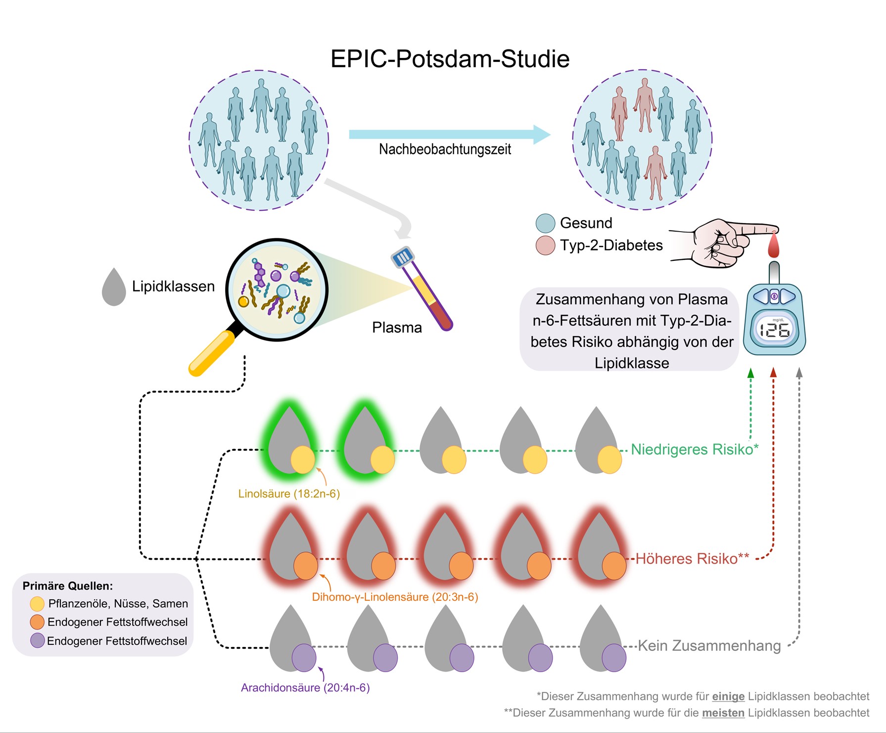 Schon früher haben Forschende die Blutspiegel an Omega-6-Fettsäuren, einer Gruppe mehrfach ungesättigten Fettsäuren, wie Linolsäure oder Dihomogammalinolensäure, mit einem geringeren bzw. höheren Diabetes-Risiko in Verbindung gebracht. Die Fettsäuren wurden jedoch nur im Gesamtplasma oder in recht umfangreichen Plasmafraktionen bestimmt.