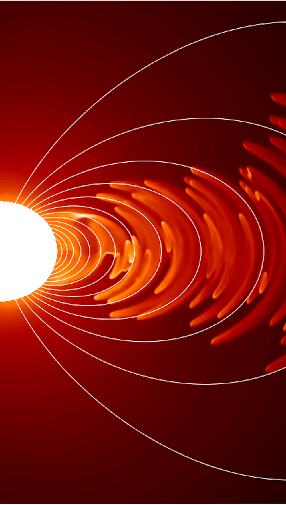 Like the Sun, massive stars have stellar winds – an energetic stream of charged particles. These plasma winds respond to magnetic fields and can create a structure, the magnetosphere. All stars and planets with magnetic fields, including the Earth, have a magnetosphere. It protects the Earth from energetic cosmic radiation. The plasma, which can move at thousands of kilometres per second, is subject to extreme centrifugal forces. It has been proposed that this magnetic mechanism can be the reason for the tightly bundled explosion of massive stars, relevant for long-duration gamma-ray bursts, X-ray flashes, and other supernovae features.