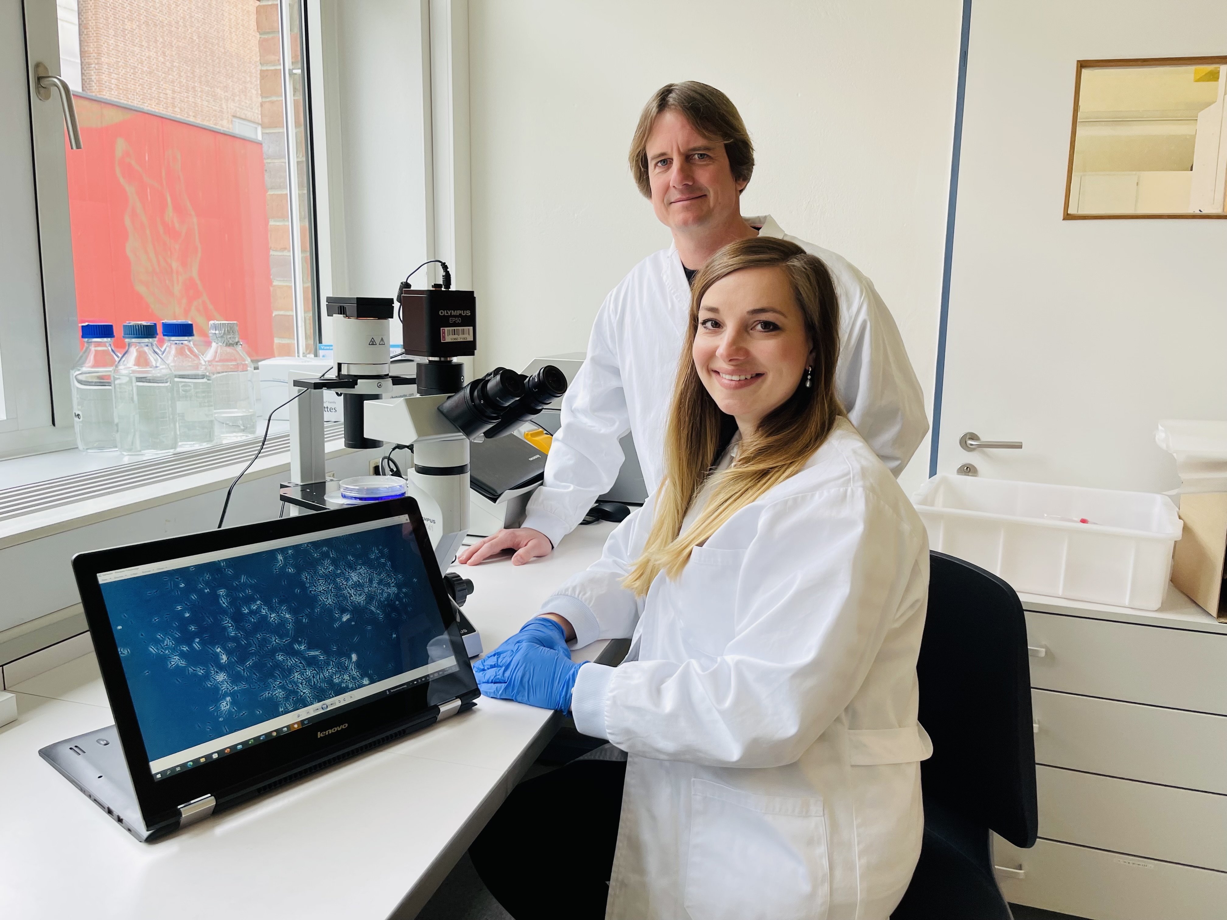 PhD student Cynthia Bülck and Professor Christoph Becker-Pauly from the Institute of Biochemistry at the CAU have discovered an important mechanism by which the composition of the intestinal microbiome is regulated.
