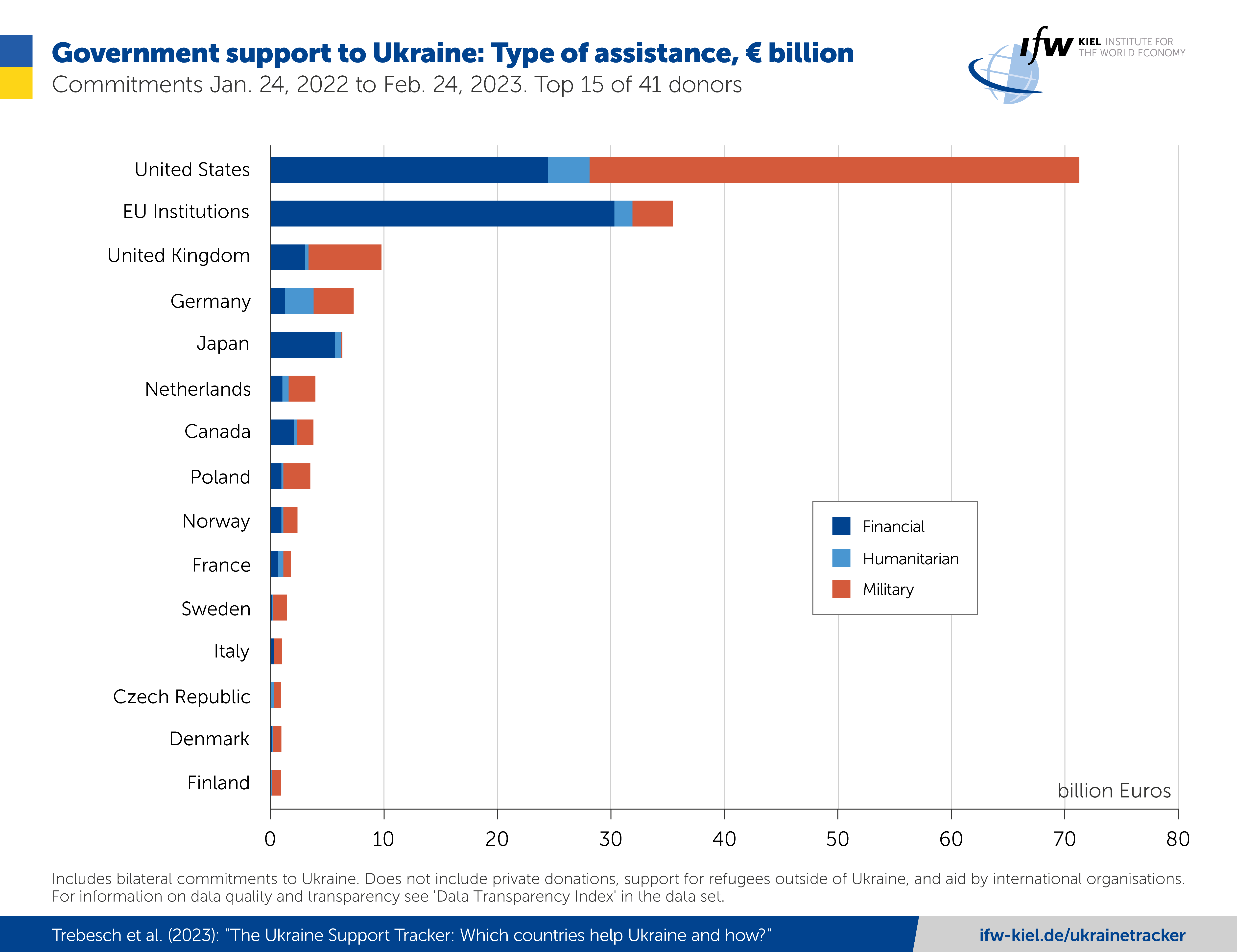 The Ukraine Support Tracker (https://www.ifw-kiel.de/topics/war-against-ukraine/ukraine-support-tracker/) lists and quantifies military, financial, and humanitarian aid pledged to Ukraine since January 24, 2022 (currently through February 24, 2023). It covers 40 countries, specifically the EU member states, other members of the G7, as well as Australia, South Korea, Norway, New Zealand, Switzerland, Turkey, China, Taiwan, and India. Also, EU institutions are included as a separate donor. The tracker lists government-to-government commitments; private donations or those from international organizations such as the IMF are not included in the main database. Flows going into other countries like, for example, Moldova, are not included.