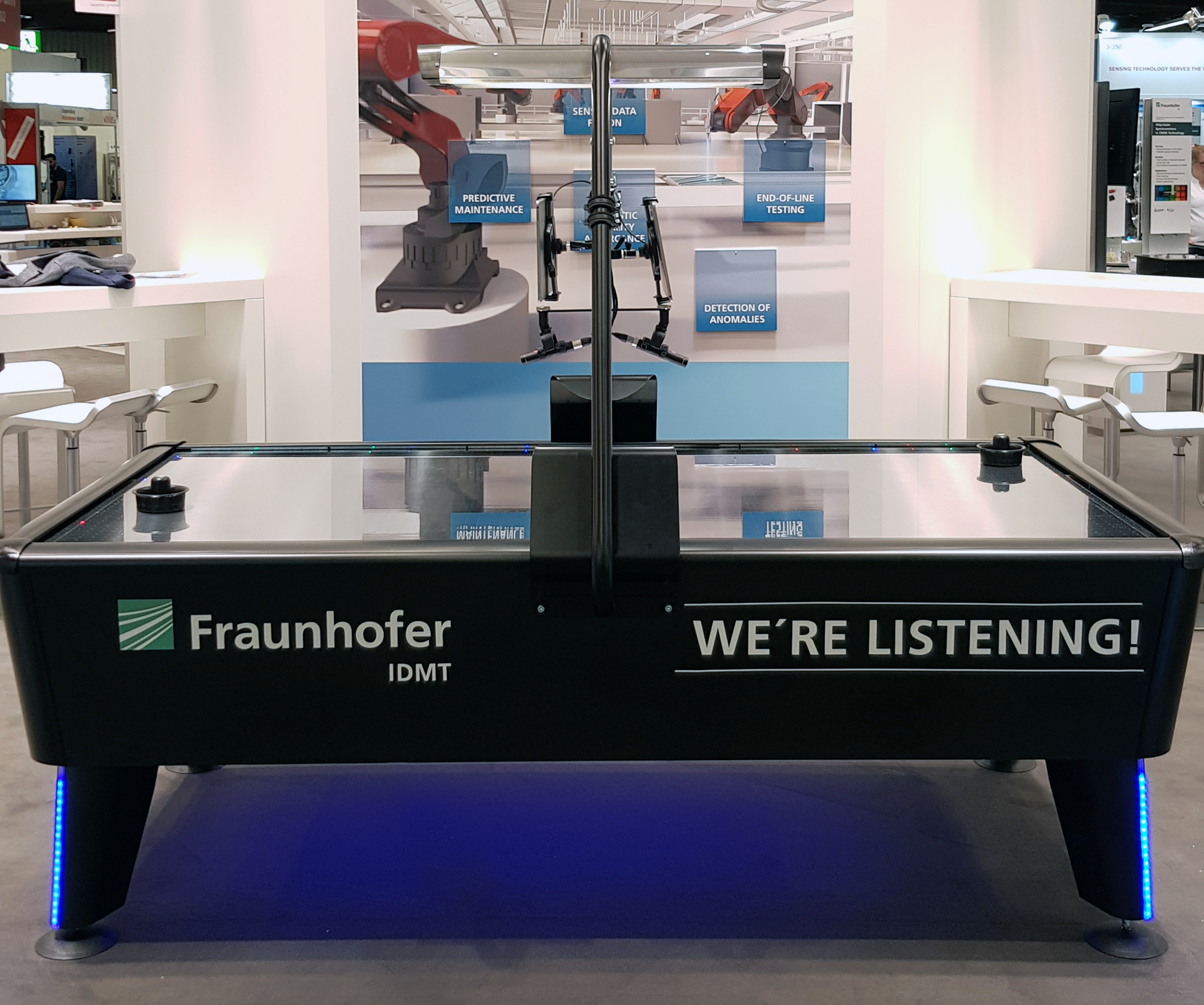 Besuchen Sie unsere Expertinnen und Experten für industrielle Geräuschanalyse am Fraunhofer-Stand A12 in Halle 16 und testen Sie unsere akustische Erkennungsgenauigkeit bei einer Partie Air-Hockey!