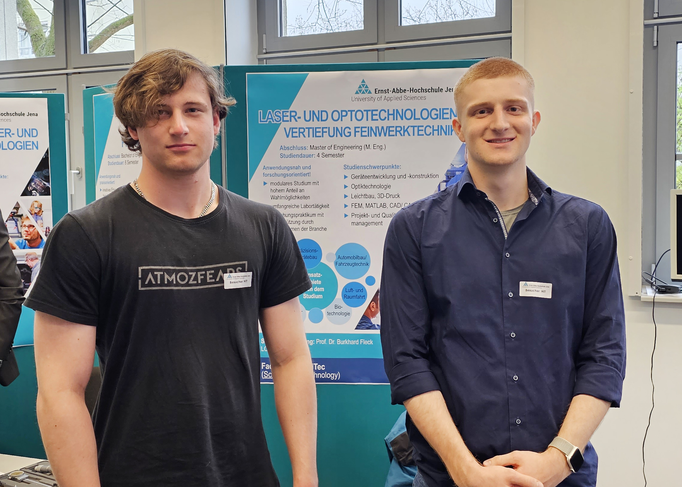 Die Interessierten kamen zum Teil von weit her, z. B. aus Hamburg, Stuttgart und Cottbus. Die weiteste Anreise hatten vermutlich zwei junge Männer, die extra für den HIT aus der Schweiz nach Thüringen gekommen sind. „Jena ist ein Hotspot für Optik und die Ernst-Abbe-Hochschule Jena gilt als eine der besten Hochschulen für ein Studium der Laser- und Optotechnologien“, sagte Nico Kirchner aus St. Gallen. „Da haben wir uns einfach auf den Weg gemacht, um den Hochschulinfotag zu besuchen und die Stadt anzuschauen“, ergänzte Malte Herold aus dem Schweizer Kanton Thurgau.