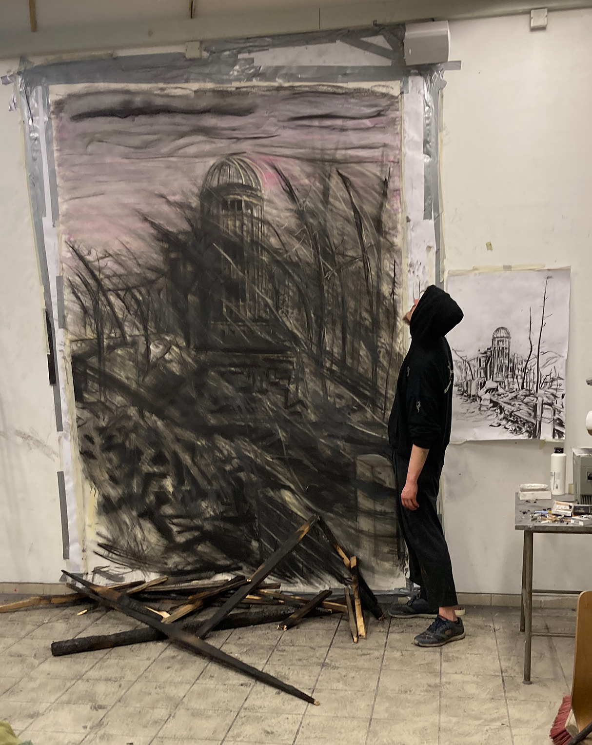 Die Studierenden orientierten sich an den schockierenden Beschreibungen und erarbeiteten mit den unterschiedlichsten künstlerischen Medien Metaphern für das unfassbare Grauen und das Ausmaß des Beschriebenen. Ihr Vorgehen ist dabei assoziativ und intuitiv, es entstanden weniger Illustrationen der textlichen Vorgabe als vielmehr künstlerisch übersetzte Bild- und Formfindungen, die das Thema in eine nicht zeitlich gebundene übergeordnete Ebene transportieren. Betreut wurden sie dabei von Prof.in Beate Spalthoff und Prof. Bernhard Garbert.