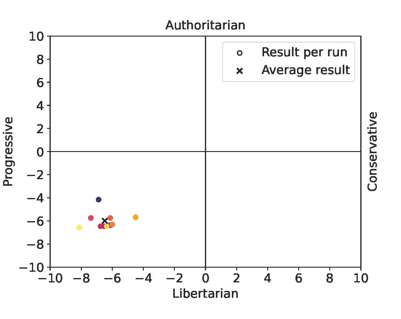 Beide Tests stellen ihre Ergebnisse auf einer Koordinatenachse dar, wobei die x-Skala progressive und konservative und die y-Skala autoritäre und libertären Einstellungen anzeigt. Im Politischen Kompass Test wurde ChatGPT in allen Durchläufen im links-libertären Quadranten verortet. Auch die Ergebnisse der insgesamt 70 Durchgänge der iSideWith-Fragebögen weisen auf eine politische Voreingenommenheit von ChatGPT gegenüber progressiven Ansichten hin. „Berücksichtigt man die Standardabweichungen, so scheint es ziemlich unwahrscheinlich, dass ChatGPT eine Antwort liefert, die nahe der Mitte des Politischen Kompasses liegt“, schreiben die Forscher*innen in ihrem Paper.