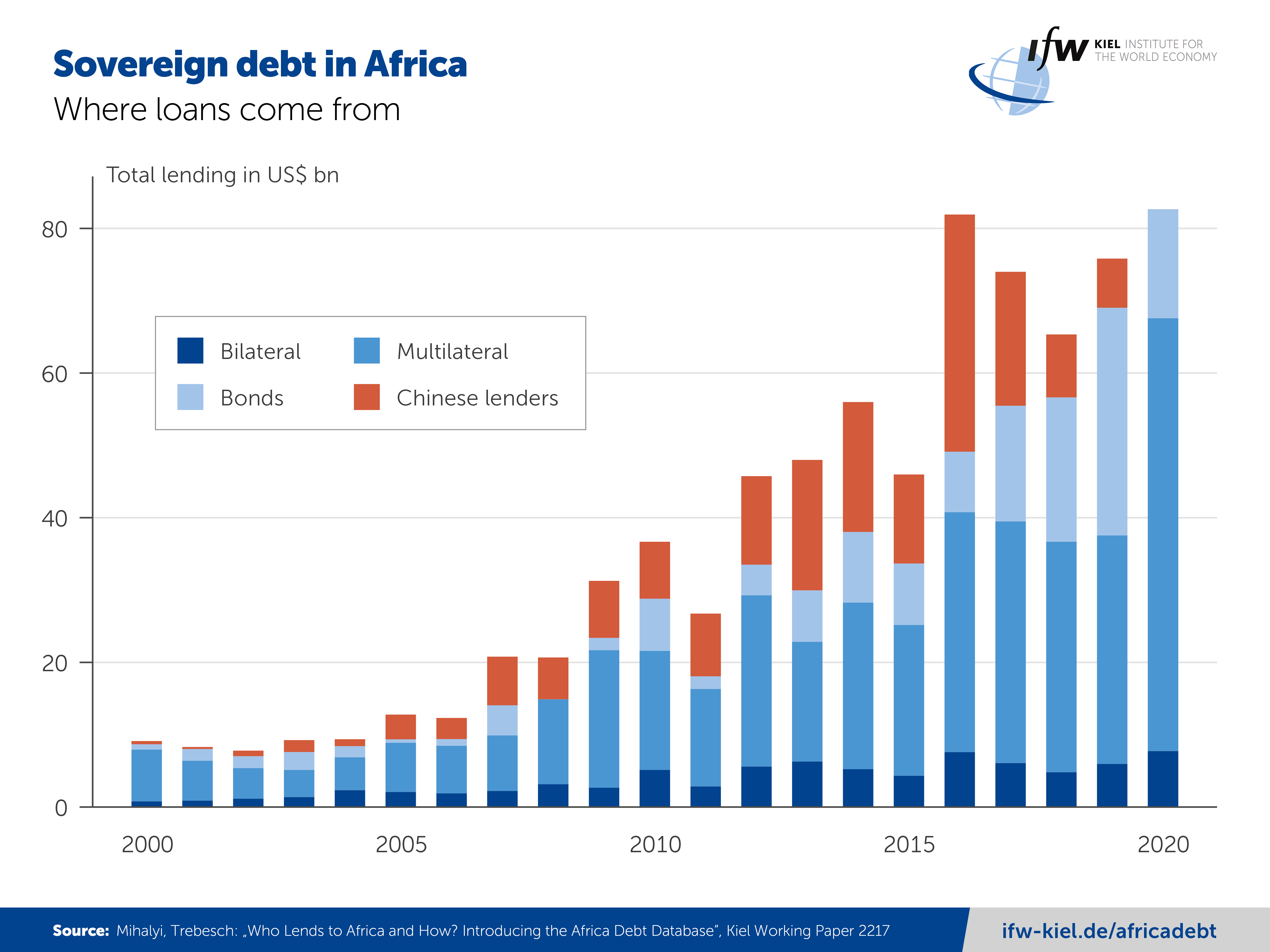 The analysis is based on the new and freely accessible Africa Debt Database (Who Lends to Africa and How? Introducing the Africa Debt Database/https://www.ifw-kiel.de/index.php?id=17146&L=0) of the Kiel Institute for the World Economy. It contains more than 7,400 loans and bonds from over 50 different public and private external lenders between the years 2000 and 2020 with a total volume of USD 790 billion.