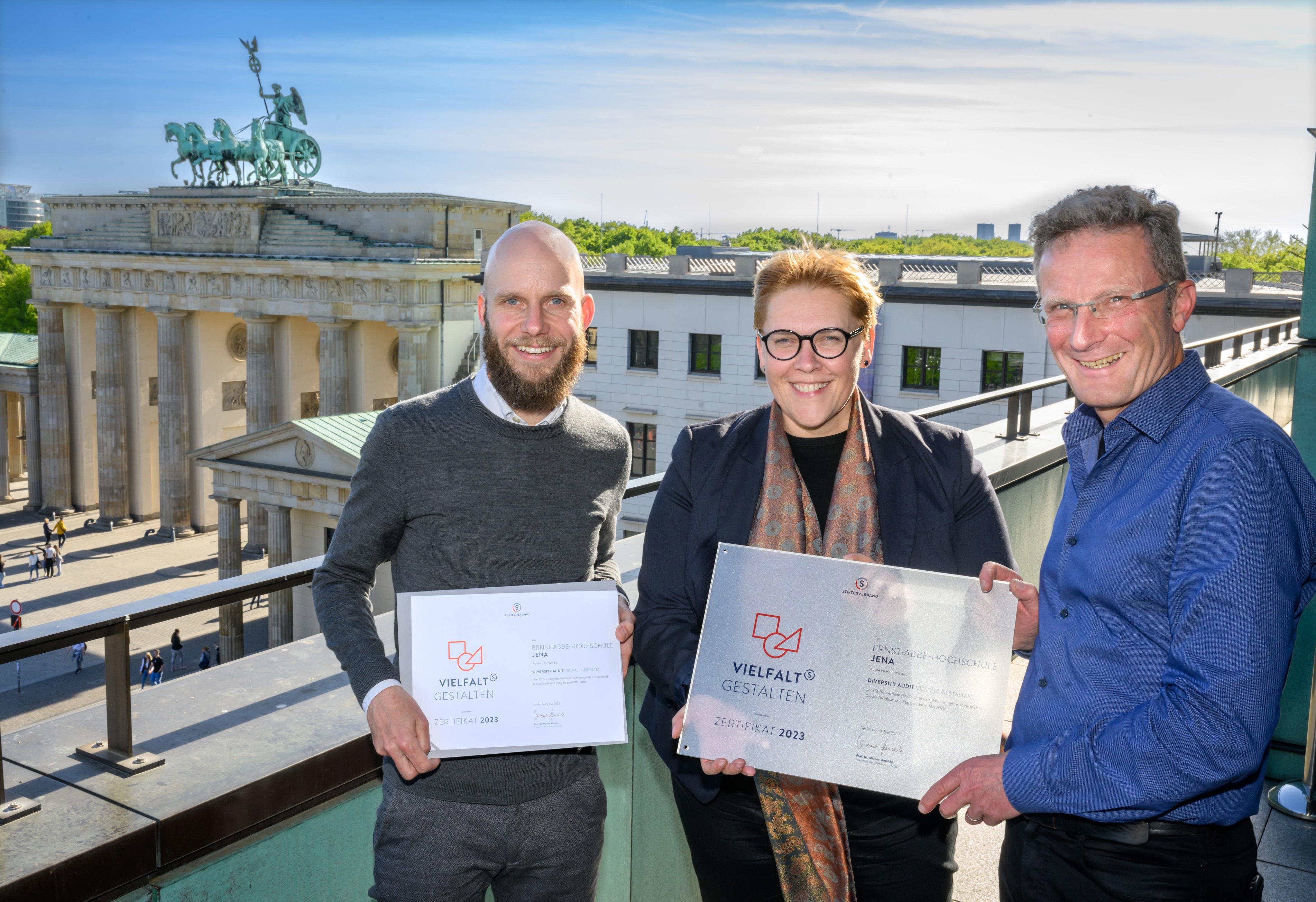 Die Ernst-Abbe-Hochschule (EAH) Jena hat nach erfolgreich absolviertem Diversity-Audit das Zertifikat „Vielfalt gestalten“ erhalten. Prof. Dr. Anna Kasten, Diversitätsbeauftragte der EAH Jena, und Prof. Dr. Mario Brandtner, Vizepräsident für Studium, Lehre und Weiterbildung der EAH Jena, nahmen die Auszeichnung am Dienstag, den 9. Mai 2023 vom Stifterverband in Berlin entgegen.