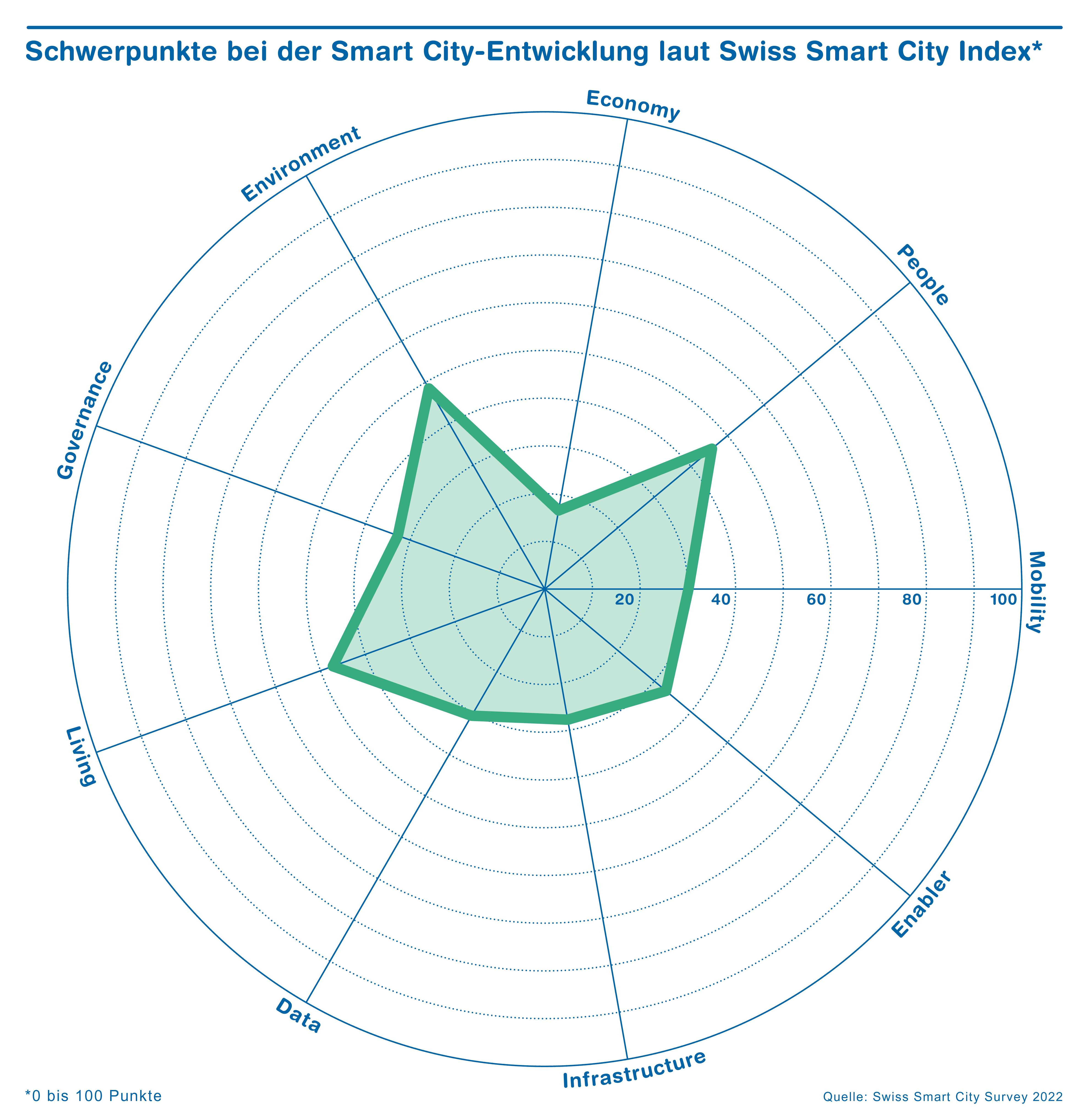 «Dank Digitalisierung, Vernetzung, Partizipation und Effizienz kann eine Smart City zu mehr Lebensqualität sowie Nachhaltigkeit beitragen und den Ressourcenverbrauch reduzieren», sagt Studienleiter Vicente Carabias-Hütter vom ZHAW-Institut für Nachhaltige Entwicklung. Um die Wichtigkeit unterschiedlicher Aspekte einer Smart City sowie die Entwicklungen über die Zeit besser darstellen zu können, wurde für die Umfrage des Swiss Smart City Survey ein Index mit neun Dimensionen entwickelt. Eine Vielzahl von Indikatoren hilft den Städten, eine Selbstbeurteilung ihrer Smart City-Entwicklung vorzunehmen, wobei «Smart Environment», «Smart People» und «Smart Living» am ausgeprägtesten sind. Insgesamt wurden 302 bestehende Projekte von teilnehmenden Städten in verschiedenen Dimensionen genannt.