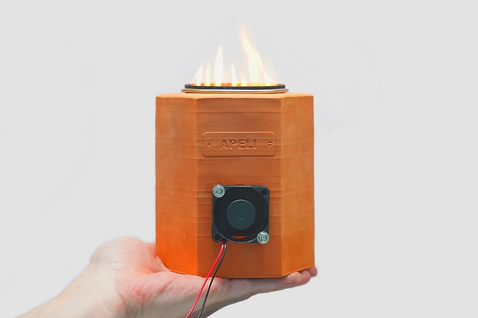 Im vom DBFZ entwickelten Kocher „Apeli“ basiert die Verbrennung auf einem mehrstufigen Prozess, der es ermöglicht, den Brennstoff (Holzpellets und lokale Reststoffe wie Bambus oder Palmkernschalen) thermisch komplett zu nutzen. Dabei wird die Biomasse zuerst vollständig in ein Brenngas umgewandelt, welches anschließend mit Luft sauber verbrannt wird. Die Nutzung einer handelsüblichen Konservendose (73x110 mm) als Brennkammerbasis ermöglicht die äußert kleinen Abmaße des Brenners mit entsprechend geringem Materialeinsatz. Um die Kosten weiter zu verringern, wurde eine Hülle aus Keramik entwickelt, die im Gießverfahren günstig in großen Stückzahlen produziert werden kann. Der Kocher beinhaltet auch einen Topfhalter, der in Form eines außenliegenden Gestells ausgeführt ist, den Brenner sicher beherbergt und auch große und schwere Töpfe tragen kann. Der geschätzte Verkaufspreis in Togo wird bei einer Massenproduktion ca. 10 USD betragen und ist damit für breite Bevölkerungsschichten erschwinglich.