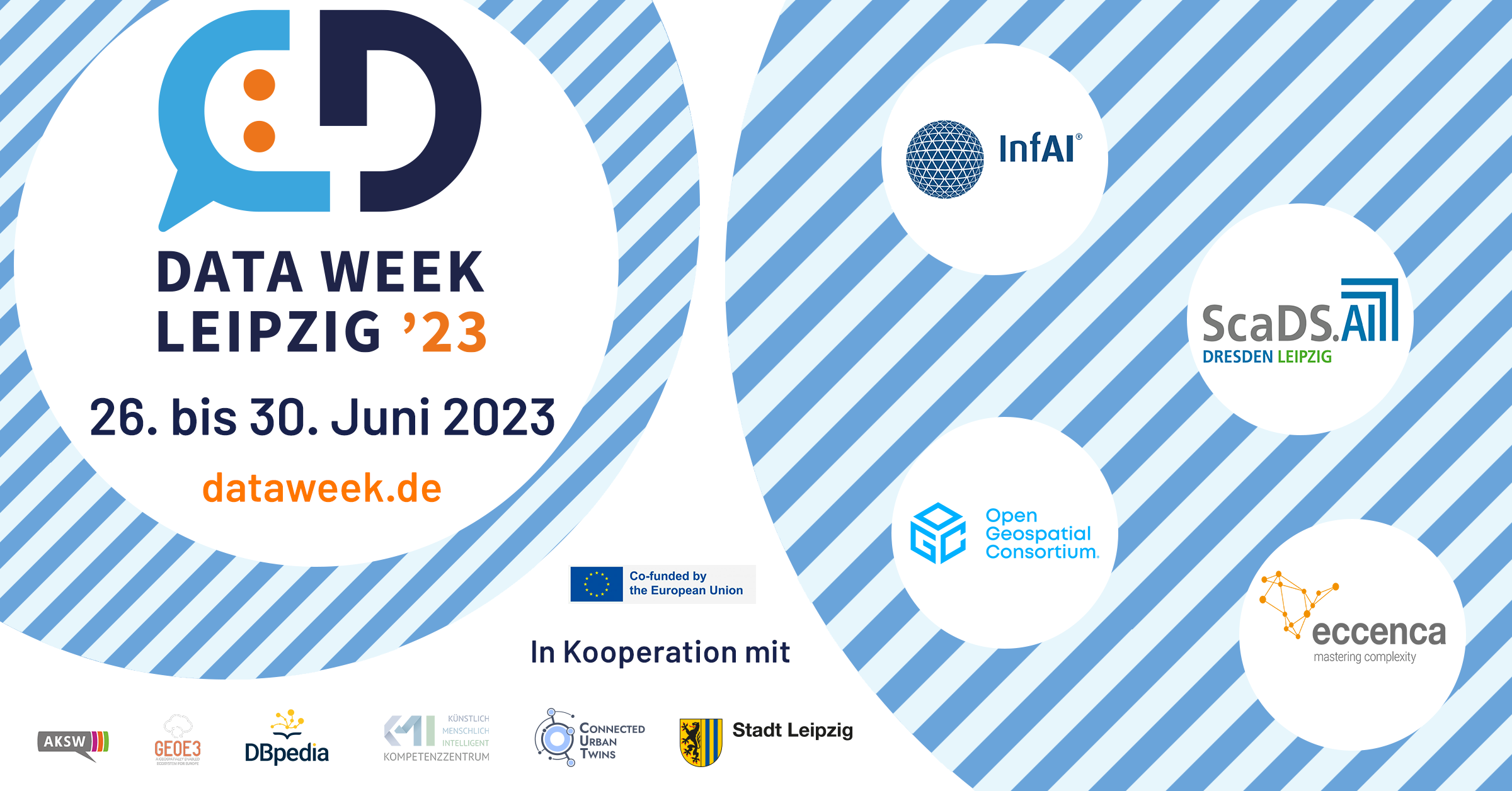 Die Data Week Leipzig wächst und baut die im vergangenen Jahr geschaffene Netzwerkplattform durch neue Kooperationspartner und Veranstaltungsformate aus. Um auch außerhalb der sächsischen Landesgrenze sichtbar zu sein, haben sich das Institut für Angewandte Informatik (InfAI) e.V., ScaDS.AI Dresden/Leipzig und die eccenca GmbH dem neuen Partner Open Geospatial Consortium (OGC) angeschlossen. Vom 26. bis 30. Juni 2023 werden sie gemeinsam mit dem Referat Digitale Stadt der Stadt Leipzig sowie Mitarbeiterinnen des CUT – Connected Urban Twin Projektes die Data Week im Neuen Rathaus Leipzig veranstalten. Der Fokus der Veranstaltungswoche liegt auf den Themen Digitalisierung, Daten, Künstliche Intelligenz und Herausforderungen der Stadtentwicklung. Vor allem soll die Bedeutung internationaler Datenräume für Strategien und Maßnahmen des Klimaschutzes hervorgehoben werden.