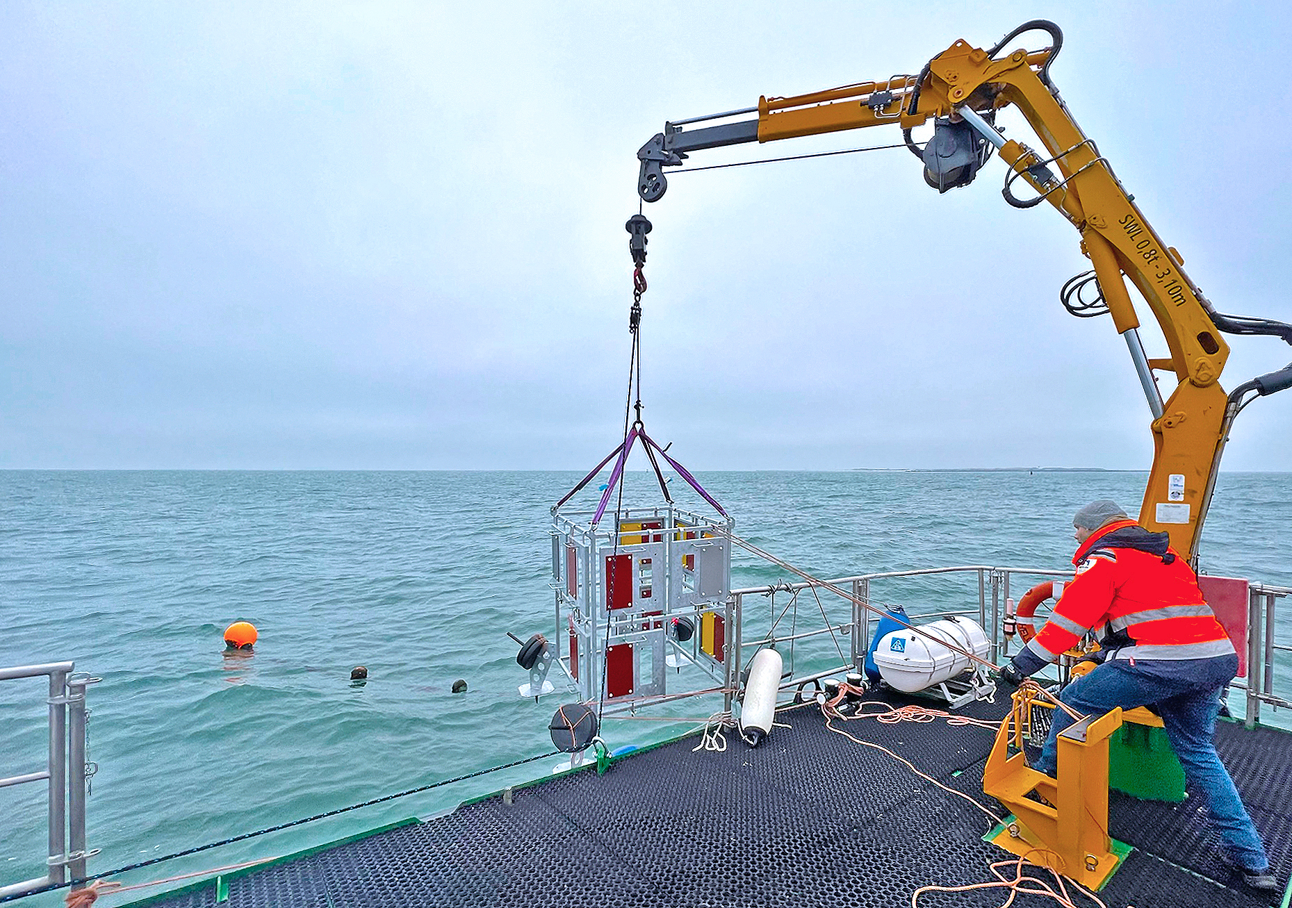 Zudem wurde das Unterwassertestfeld »MarGate« 2009 vom AWI-Zentrum für Wissenschaftliches Tauchen auf Helgoland eingerichtet, um ein leicht zugängliches marines Unterwasserversuchsgebiet zu schaffen. Das Gebiet ist etwa 270 x 100 Meter groß, hat zwischen fünf und zehn Meter Wassertiefe und ist durch sechs rote Oberflächenbojen als maritime Exklusivzone für den Schiffsverkehr gekennzeichnet. Mit Unterstützung der Helgoländer und Cuxhavener Mitarbeitenden des Wasserstraßen- und Schifffahrtsamtes Elbe-Nordsee, der Besatzung des Arbeitsbootes »Lumme«, dem Mehrzweckschiff »Neuwerk« sowie den Forschungstauchenden des Alfred-Wegener-Instituts, Helmholtz-Zentrum für Polar- und Meeresforschung (AWI) haben Mitarbeitende des Fraunhofer IFAM nun in diesem Unterwassertestfeld einen rund 300 Kilogramm schweren, kubusförmigen Lander aus feuerverzinktem Stahl in neun Metern Wassertiefe auf dem felsigen Grund der Nordsee abgesetzt.