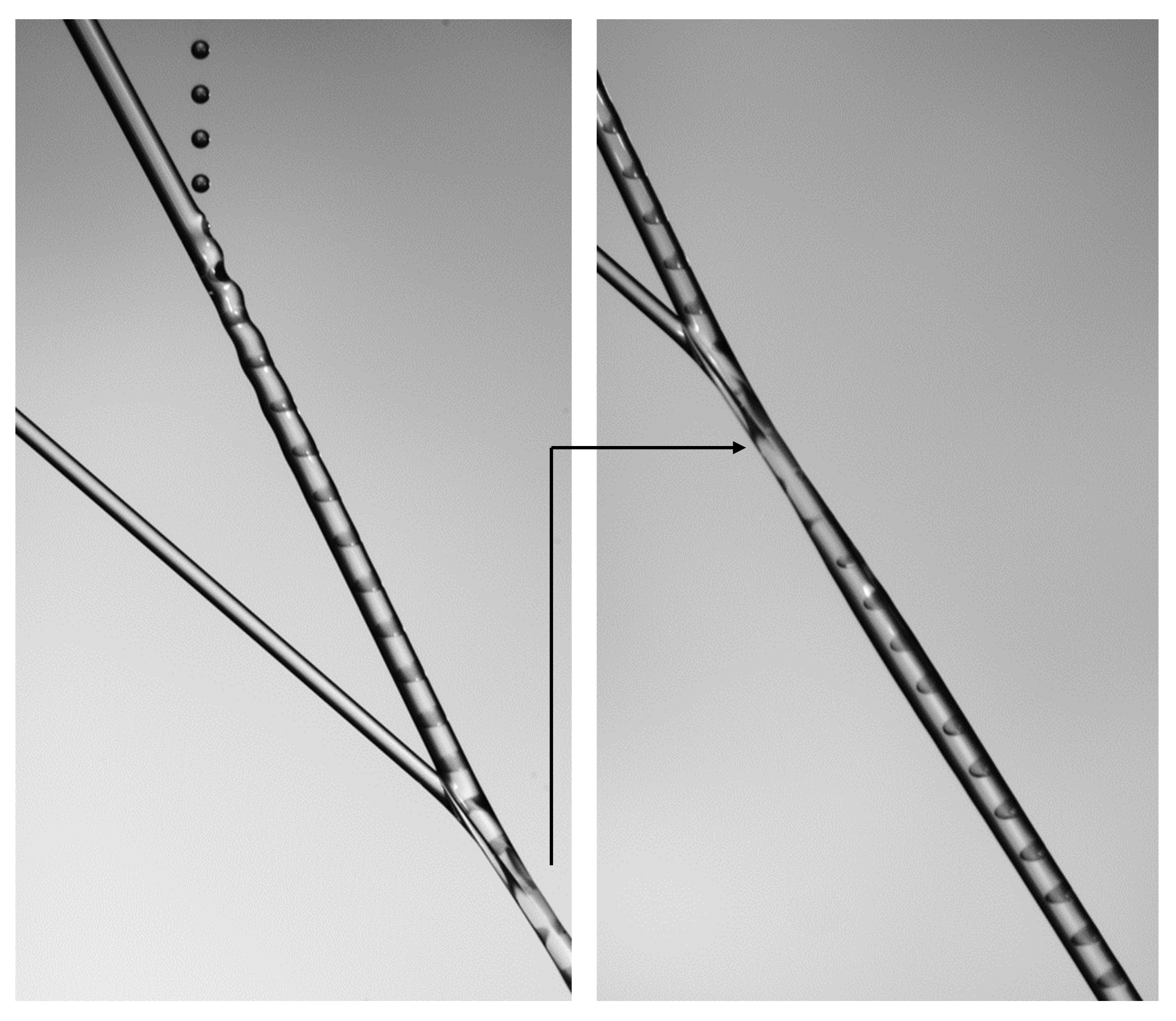 In der nun vorgestellten Methode verbindet sich ein regelmäßiger Tröpfchenstrom, in dem sich Zellen oder Wirkstoffe befinden, mit einem Flüssigkeitsstrahl aus Alginsäurelösung. Die aus Braunalgen gewonnene Alginsäure bildet in Verbindung mit Calcium Kationen ein elastisches Gel mit dem Namen Alginat – ähnlich dem in der Molekularküche üblichen Verfahren zur Herstellung von Kaviarperlen. Dieses Hydrogel ist einerseits voll biokompatibel und verhindert andererseits, dass die eingelagerten Tröpfchen miteinander verschmelzen. Zur Aushärtung des Stroms aus Alginsäurelösung wird daher kontinuierlich ein zweiter Strahl mit Calcium Kationen darauf geschossen. Die so entstandene Faser, von der bis zu 5 Meter pro Sekunde wachsen, kann danach einfach auf einem Drehteller gesammelt werden. All diese Schritte erfolgen an der Luft und nicht wie bisher in mikrofluider Herstellung.