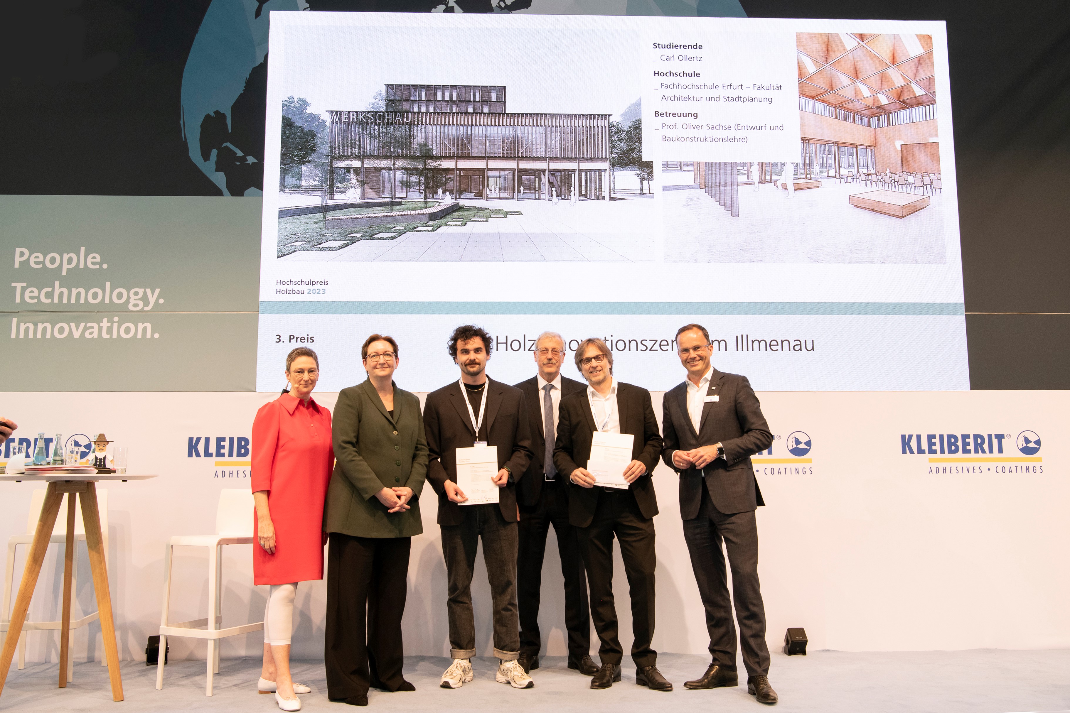 Die Arbeit des Masterstudierenden wurde von der Bundesministerin für Wohnen, Stadtentwicklung und Bauwesen, Klara Geywitz, am 16.05.2023 auf der LIGNA, der internationalen Fachmesse für die internationale holzbe- und -verarbeitende Industrie, in Hannover ausgezeichnet.
