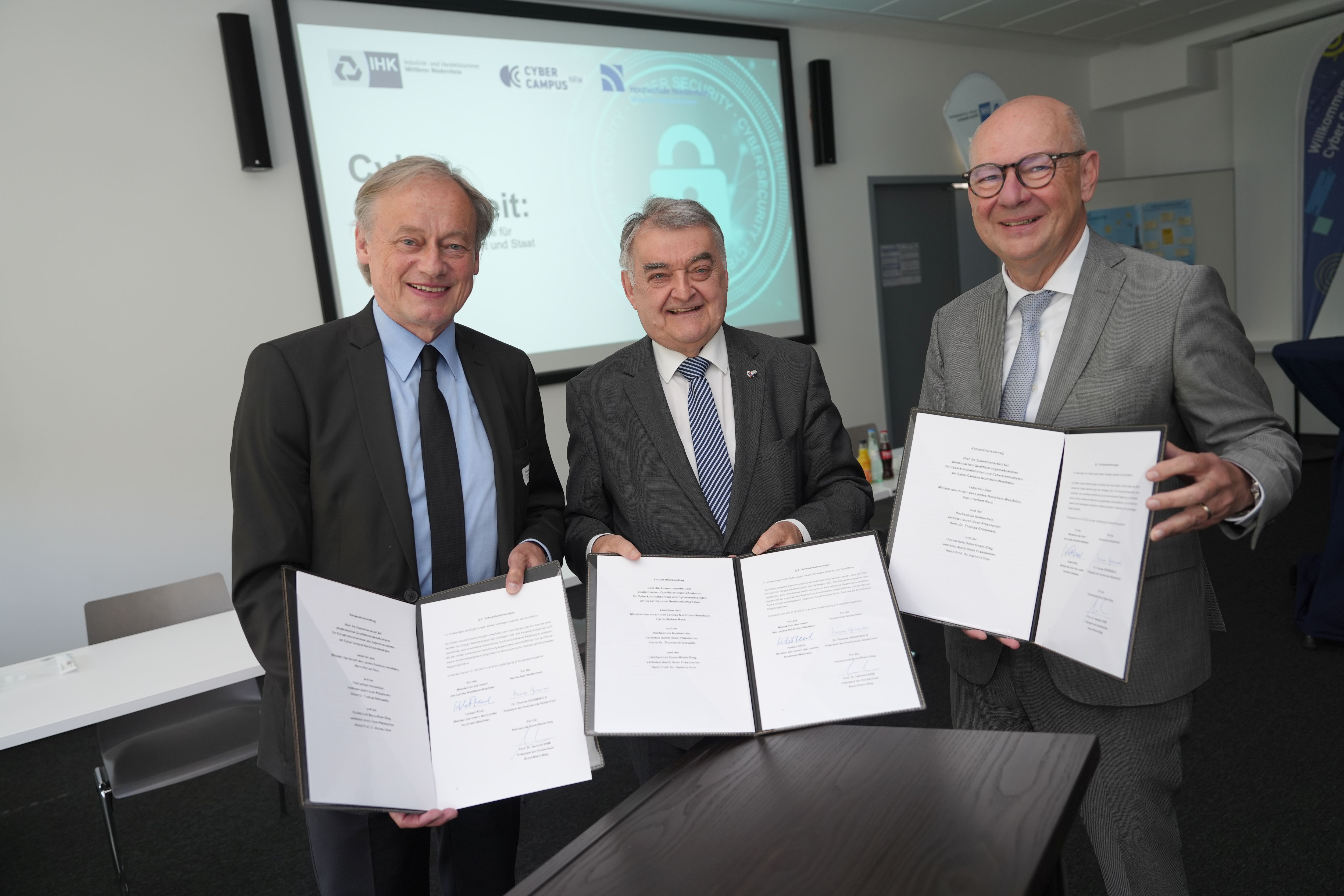 Das Ausmaß an Computerkriminalität ist in den vergangenen Jahren stark angestiegen. Um den Druck auf Cyberkriminelle zu erhöhen und die Polizeivollzugsbeamtinnen und Polizeivollzugsbeamte bestmöglich auf die gestiegenen Anforderungen vorzubereiten, haben NRW-Innenminister Herbert Reul, Dr. Thomas Grünwald (Präsident der Hochschule Niederrhein - HSNR) sowie Professor Dr. Hartmut Ihne (Präsident Hochschule Bonn-Rhein-Sieg – H-BRS) am heutigen Mittwoch den Kooperationsvertrag über die Zusammenarbeit bei akademischen Qualifizierungsmaßnahmen für Cyberkriminalistinnen und Cyberkriminalisten am Cyber Campus Nordrhein-Westfalen (CCNRW) in Mönchengladbach unterzeichnet. Im vergangenen Jahr hatten die beteiligten Organisationen eine Absichtserklärung unterzeichnet, die nun durch den Kooperationsvertrag umgesetzt wird.