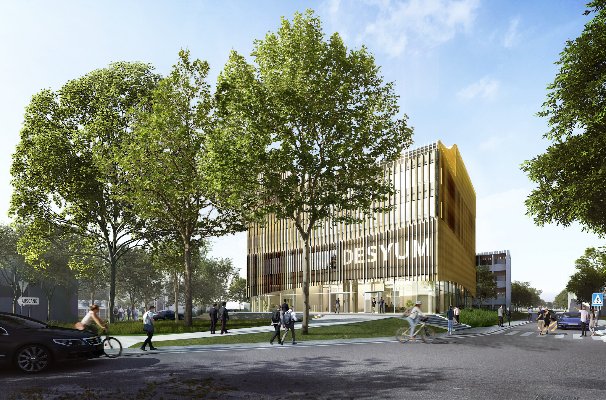 Auf seinen sechs Etagen (einschließlich Untergeschoss) wird das DESYUM 3250 Quadratmeter Nutzfläche bieten. Der Entwurf stammt vom Architekturbüro HPP Architekten aus Hamburg. Die streifenförmige Fassade aus eloxiertem Aluminium ist inspiriert von hochpräzisen Spurdetektoren, mit denen schnelle Teilchen vermessen werden können. Schwünge und Kreise im Grundriss, auf der Dachterrasse und auch in der Fassade entstanden in Anlehnung an DESYs Teilchenbeschleuniger.