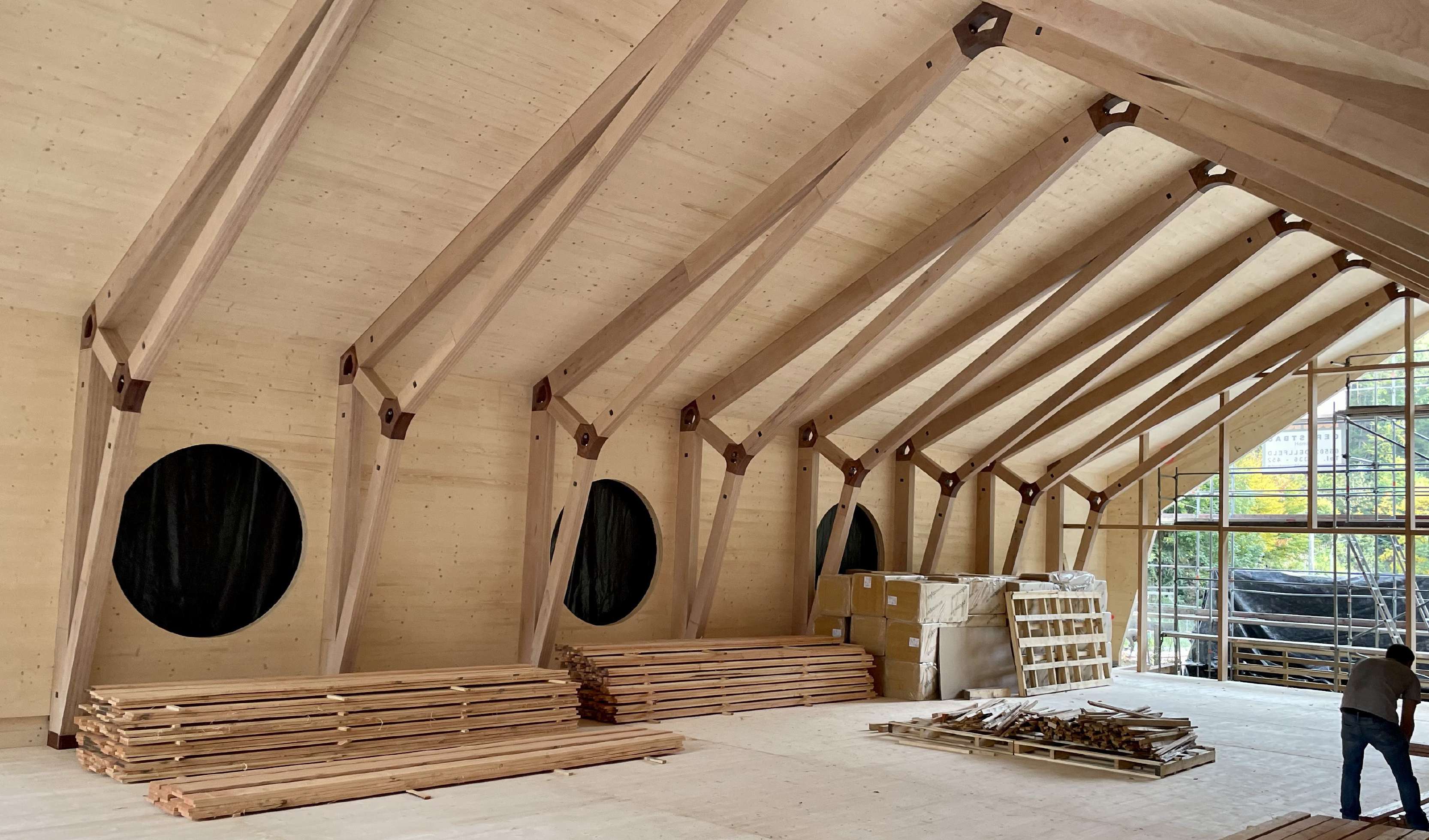 Das Tragwerk der Halle besteht aus sogenannten Dreigelenkrahmen aus Buchen-Furnierschichtholz. Die Dreigelenkrahmen werden durch die vertikalen und horizontalen Lasten aus dem Dach- und Wandtragwerk beansprucht und übernehmen auch die Queraussteifung der Halle. Das Dach- und Wandtragwerk besteht aus einschichtigen Dach- und Wandplatten aus Brettsperrholz (BSP). Die BSP-Platten dienen auch der Längsaussteifung. Die Gebäudehülle als Ganzes besteht aus vorgefertigten, 2,50 Meter breiten dreischichtigen Bauelementen. Diese vorgefertigten Elemente wurden reversibel auf den BSP-Platten befestigt. Auch im Bereich der Bodenplatte und der Fundamente wurde größtenteils auf Stahlbeton verzichtet. Das Bauwerk schließt nach unten mit einer 160 Millimeter starken BSP-Bodenplatte, die 300 Millimeter über dem Baugrund angehoben wurde. Die Bodenplatte lagert auf sogenannten Stahl-HEB-Trägern auf, die im Erdreich auf Mikropfählen reversibel gegründet sind. Nur bei den Pfählen wurde ein Minimum an Beton eingesetzt.