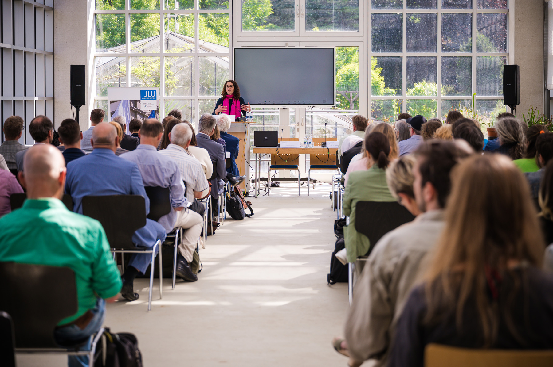 Wenn wir die Lebensgrundlagen der Menschen langfristig sichern wollen, ist ein zukunftsorientiertes und reflektiertes Handeln nötig. Dieses muss die Begrenztheit natürlicher Ressourcen unseres Planeten anerkennen und die Befriedigung der Bedürfnisse aller Menschen heute und in Zukunft im Einklang mit der Umwelt ermöglichen. Die Justus-Liebig-Universität (JLU) treibt ihre nachhaltige Transformation systematisch voran: Sie hat ein Büro für Nachhaltigkeit (BfN) eingerichtet, die „Nachhaltigkeitsstrategie JLU 2030“ entwickelt, mit dem Panel on Planetary Thinking das disziplinübergreifende planetare Denken an der JLU verankert und diverse wissenschaftliche wie auch betriebliche Projekte zum Thema Nachhaltigkeit auf den Weg gebracht. Diese wegweisenden Entwicklungen wurden am 5. Juni 2023 im Beisein der Hessischen Ministerin für Wissenschaft und Kunst, Angela Dorn, im Palmenhaus des Botanischen Gartens präsentiert.