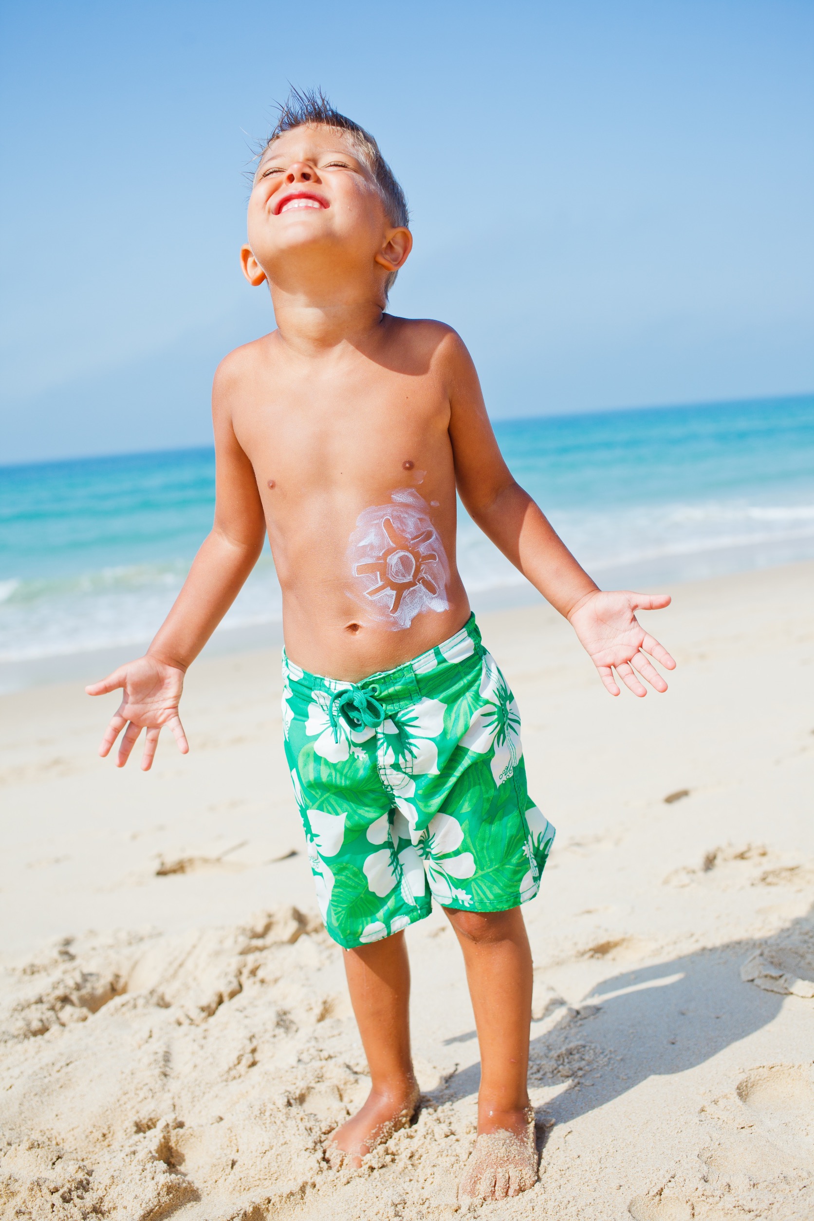 Dennoch zeigt jedes Kind eine individuelle Empfindlichkeit der Haut gegenüber der Sonne („Phototyp“). Allgemein gilt: umso heller der Hauttyp, desto kürzer die Eigenschutzzeit der Haut und desto mehr Schutzmaßnahmen sind erforderlich. Für begrenzte Aufenthalte im Freien z.B. in Deutschland kann ein Sonnenschutzprodukt mit Lichtschutzfaktor 30 für Kinder durchaus ausreichen. Bei Aufenthalten am Meer oder in den Bergen oder einfach bei Vorliegen eines hellen Hauttyps sind Sonnencremes, die einen höheren Lichtschutzfaktor (LSF 50 oder 50+) ausweisen, jedoch sicherer. Für eine gute Schutzwirkung sollte die Sonnencreme 20-30 min vor der Sonnenexposition großzügig auf alle Körperpartien aufgetragen werden, nachcremen nicht vergessen!