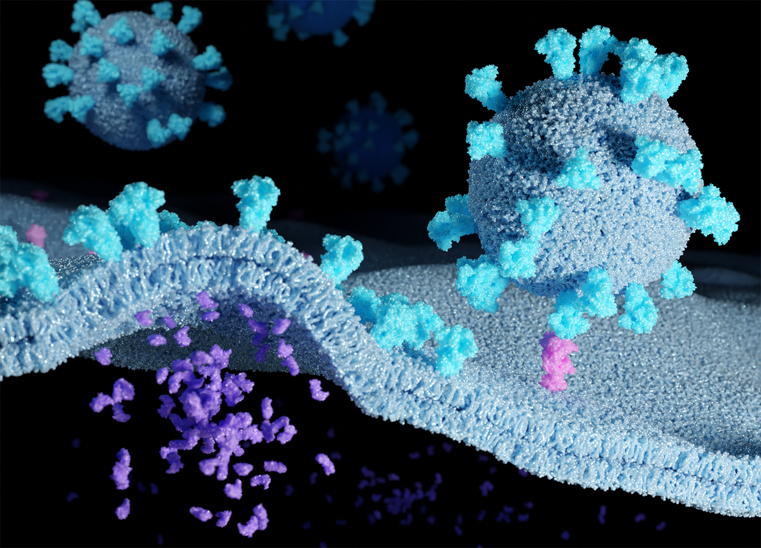SARS-CoV-2 carries an average of 20 - 40 spike proteins on its surface. With these, it binds to ACE2 receptors in the membrane of its target cells, for example in the nose and throat of humans. When these receptors are blocked with antibodies, the cell can no longer be infected. "This suggests that the binding of the virus to the ACE2 receptor is the decisive step in infection," Sauer explains.