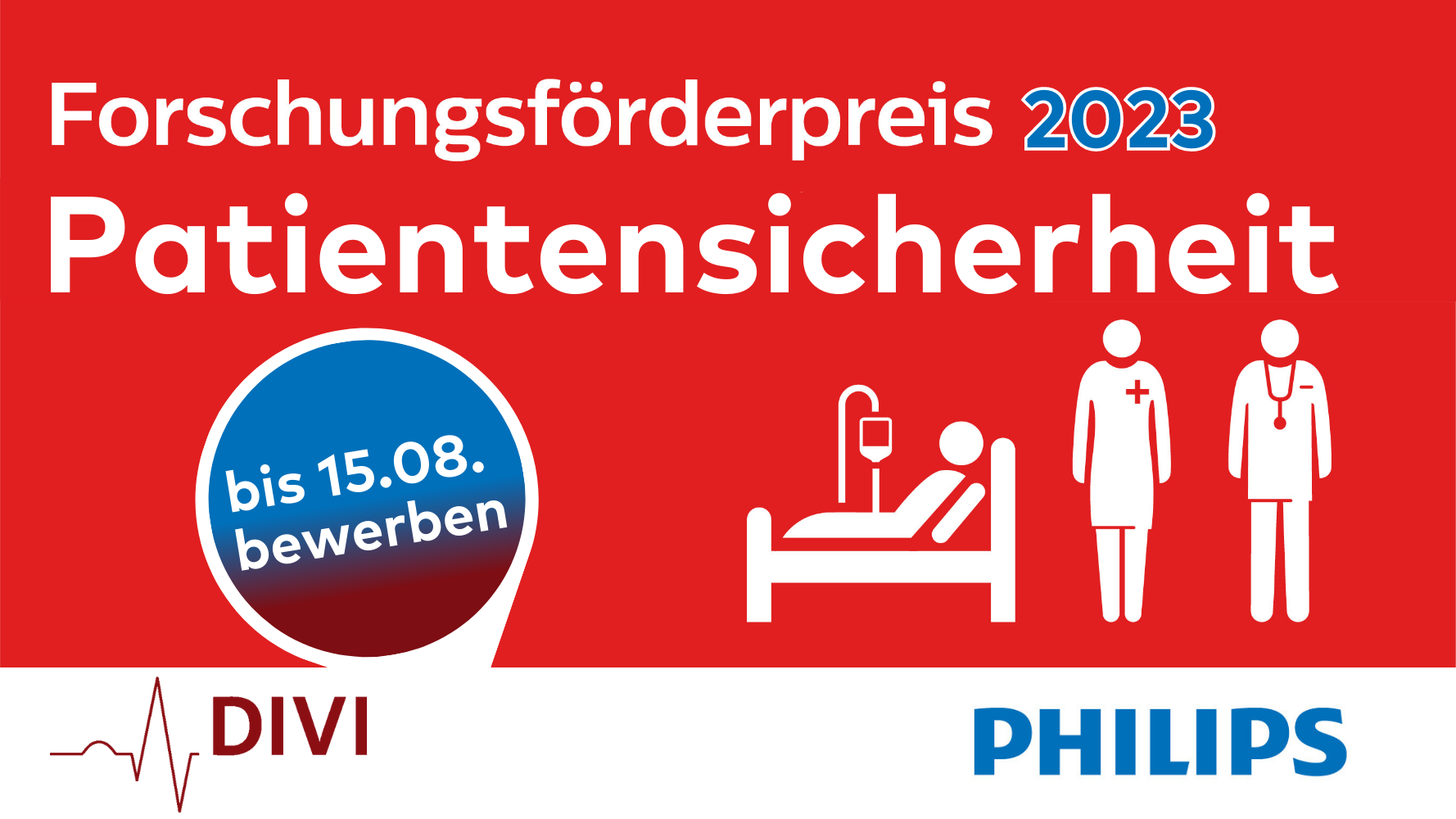 Patientensicherheit ist eine der drängendsten Herausforderungen in der EU und weltweit. Daher lobt die Deutsche Interdisziplinäre Vereinigung für Intensiv- und Notfallmedizin (DIVI) – unterstützt von der Philips GmbH – auch in diesem Jahr wieder den Forschungsförderpreis Patientensicherheit aus. 10.000 Euro Förderung sind dem Erstplatzierten sicher. Auch werden die Autoren des zweiten und dritten Platzes zum DIVI-Kongress nach Hamburg eingeladen und dürfen hier ihre jeweiligen Projekte vorstellen.