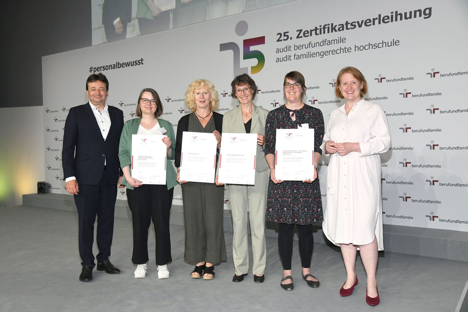 Mit der mittlerweile sechsten Zertifizierung in Folge wurde auch 2023 wieder das langjährige Engagement der Hochschule RheinMain für familien- und lebensphasenbewusste Personalpolitik ausgezeichnet. Bereits seit 2007 trägt die HSRM nun das anerkannte Qualitätssiegel, das von einem Kuratorium der berufundfamilie Service GmbH vergeben wird und zählt damit zur Spitzengruppe der zertifizierten Hochschulen in Deutschland. Insgesamt sind in diesem Jahr 323 Organisationen – 140 Unternehmen, 148 Institutionen und 35 Hochschulen – ausgezeichnet worden. Die Auszeichnung gilt als Qualitätssiegel für eine nachhaltig gestaltete betriebliche Vereinbarkeitspolitik und hat jeweils eine Laufzeit von drei Jahren.