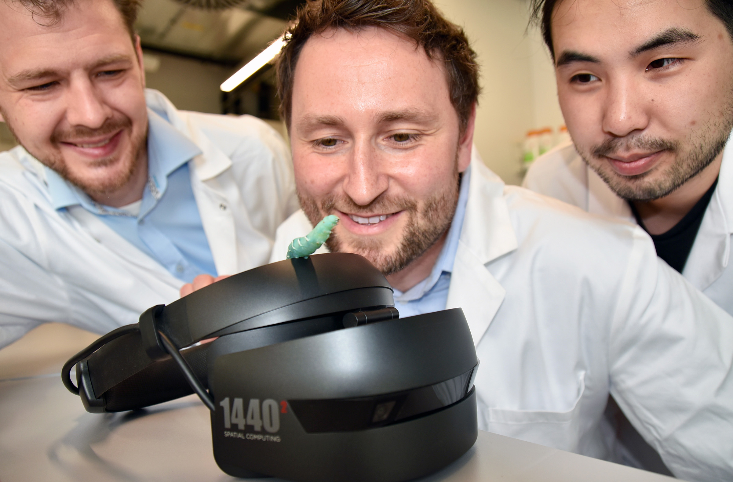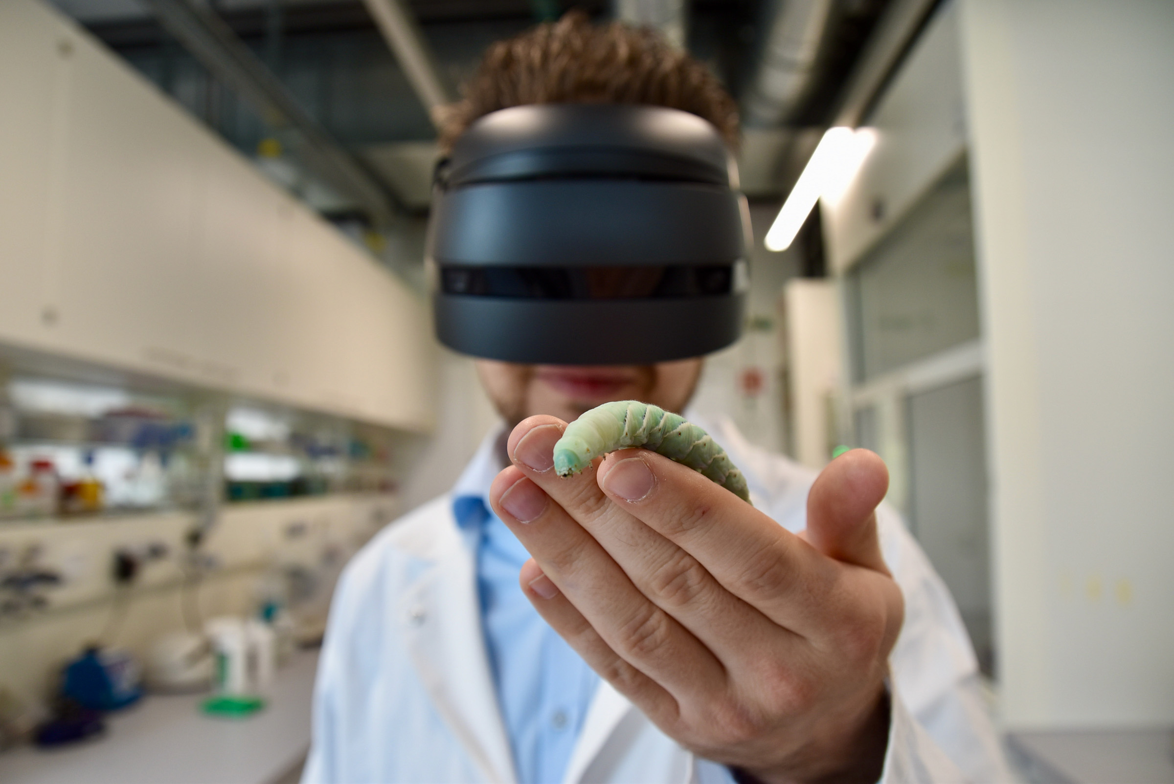 Virtual Reality oder künstliche Wirklichkeit ist eine Technologie, durch die Benutzerinnen und Benutzer mit virtuellen Objekten interagieren können. Mit dieser Technik ist es auch möglich, durch den Darm der Tabakschwärmer zu scrollen. Für die Übertragung der Forschungsdaten in die virtuelle Realität arbeitet das Gießener Team mit dem VR-Experten Viet Duc Vu und dem NWTmed-Team der JLU zusammen. NWTmed – kurz für (Natur)Wissenschaft und Technik in der Medizin – ist eine interdisziplinäre Lehr- und Lernplattform unter der Projektleitung von Dr. Johannes Lang und Dr. Holger Repp, die sich unter anderem für die Nutzung der virtuellen Realität in der naturwissenschaftlichen und medizinischen Lehre stark machen. Studienleiter Dr. Windfelder ist überzeugt: „Die virtuelle Realität ist ein Game-Changer und wird die Lehre revolutionieren.“