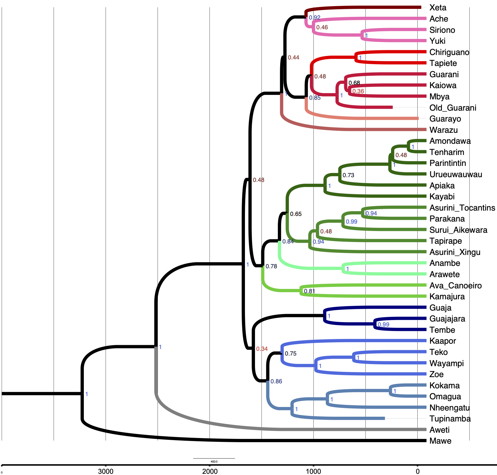 Fabrício Ferraz Gerardi, Tiago Tresoldi, Carolina Coelho Aragon, Stanislav Reichert, Jonas Gregorio de Souza, Francisco Silva Noelli: Lexical Phylogenetics of the Tupí-Guaraní Family: Language, Archaeology, and the Problem of Chronology. PLOS ONE,