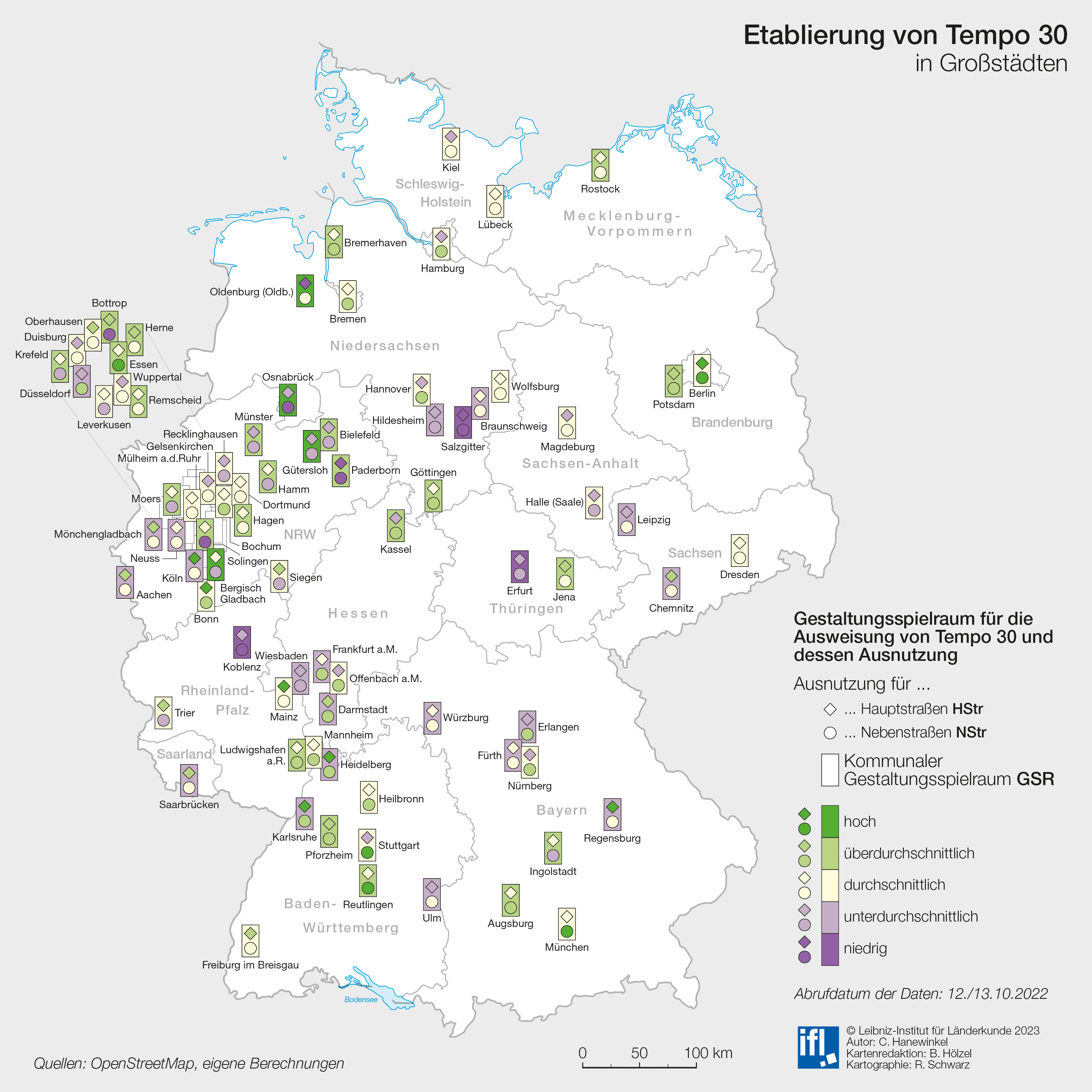 Hanewinkel, Christian & Wladimir Sgibnev (2023): Tempo 30 in Großstädten: Möglichkeiten – und Grenzen – im deutschlandweiten Vergleich. In: Nationalatlas aktuell 17 (06.2023) 3 [15.06.2023]. Leipzig: Leibniz-Institut für Länderkunde (IfL).